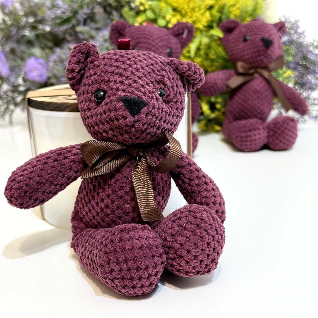 Ursuleț din pluș de culoare mov, foarte plăcut la atingere umplut cu material sintetic (vatelină). Are la gât are o fundiță de culoare maro din satin.