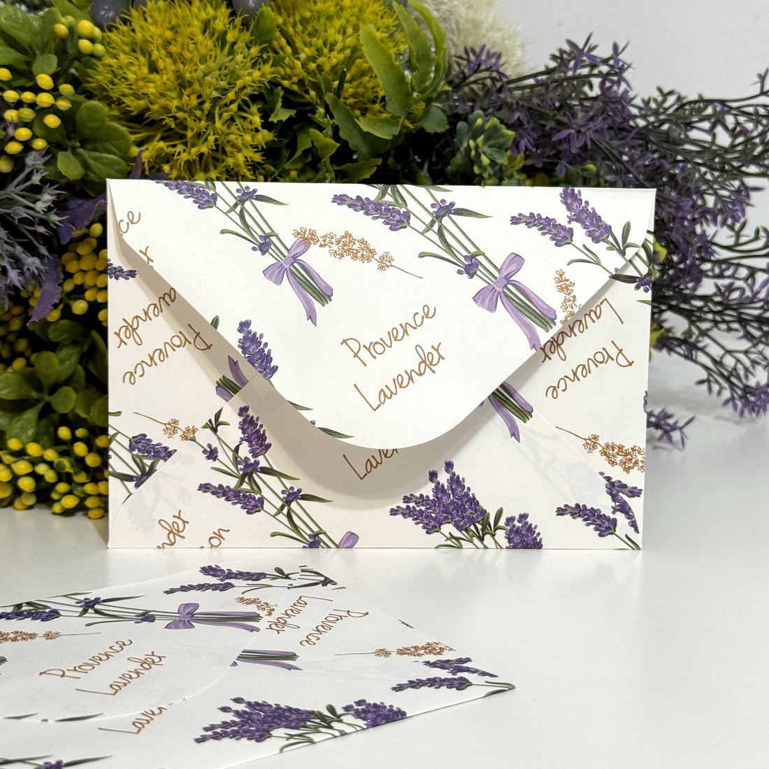 Plicuri din hârtie albe cu imprimeu lavandă se vând la set de 10 buc.