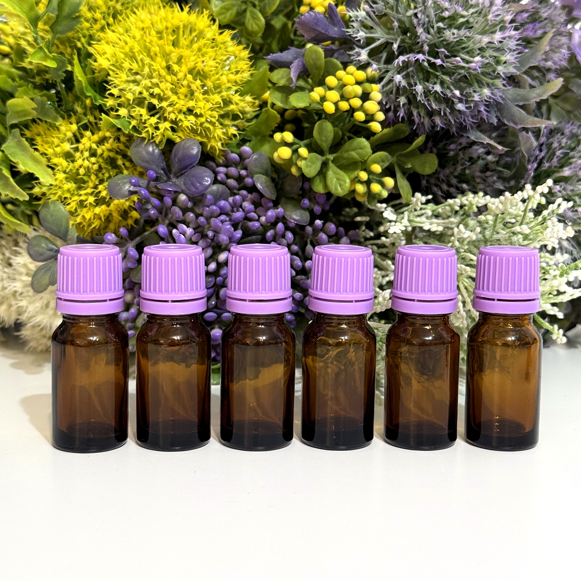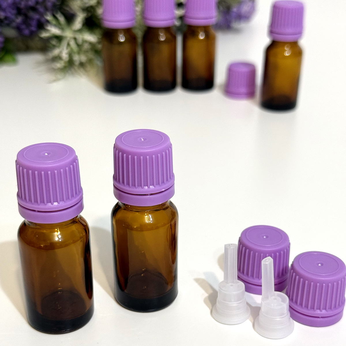 Sticluțe cu picurător din sticlă de culoare maro, capacitate de 10 ml, cu capac din plastic autosigilant de culoare mov.
