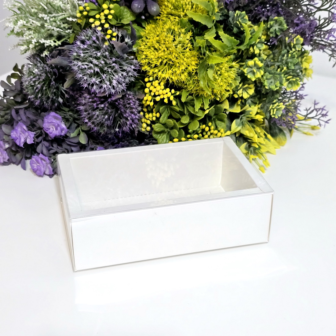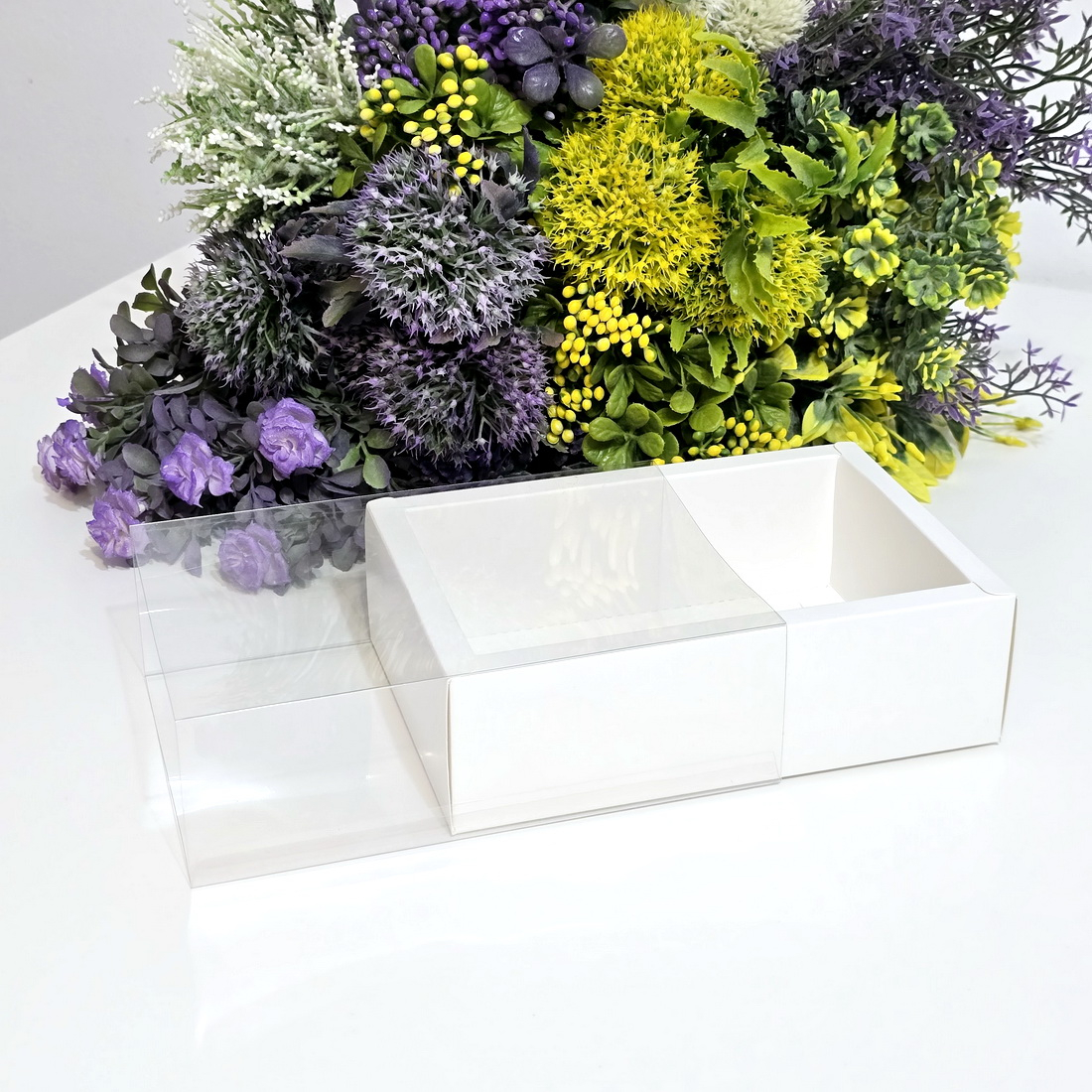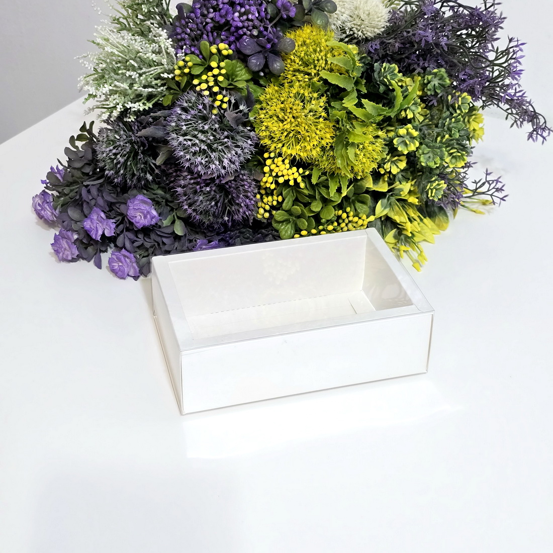 Cutiile din carton alb cu capac din plastic sunt ideale pentru cadouri diverse, pentru pachete create de dvs. sau pentru mărturii oferite pentru diverse ocazii. Cutiile pun în valoare produsele oferite. Sistemul de închidere este simplu si eficient, prin culisarea capacului din plastic transparent.