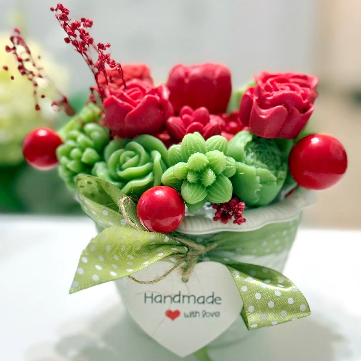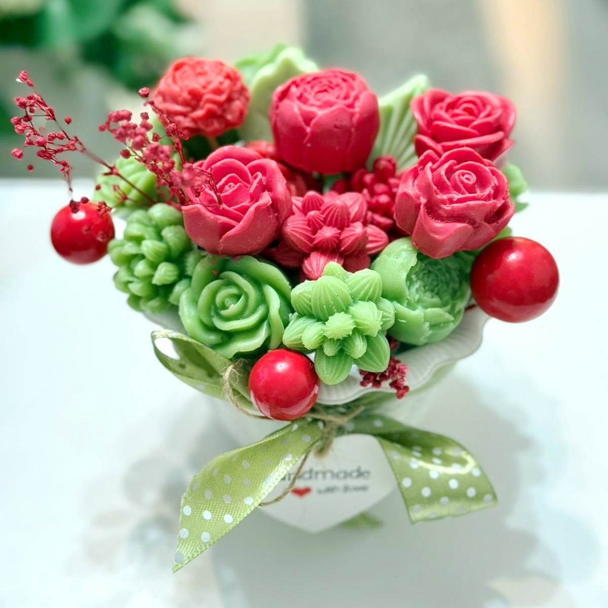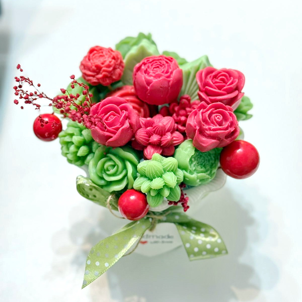 Fiecare aranjament cu flori din săpun este turnat individual. Aranjamentele sunt unicat, culorile florilor fiind diferite.