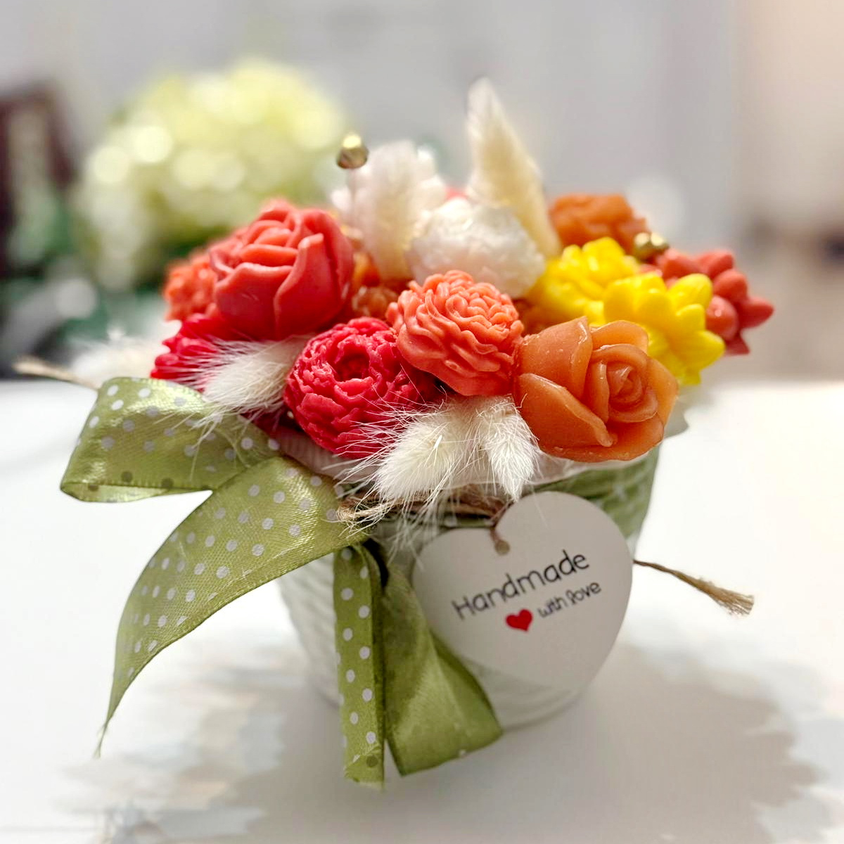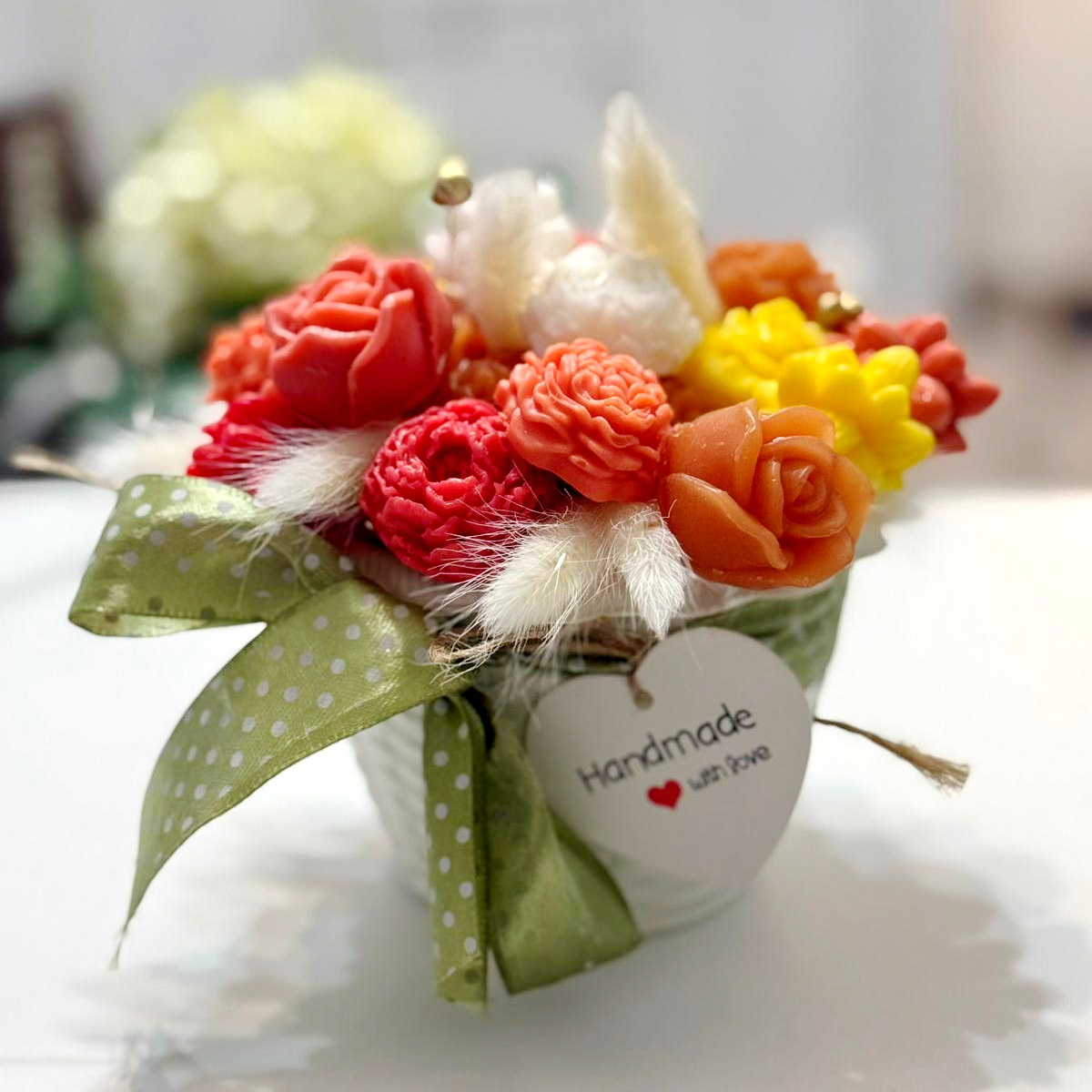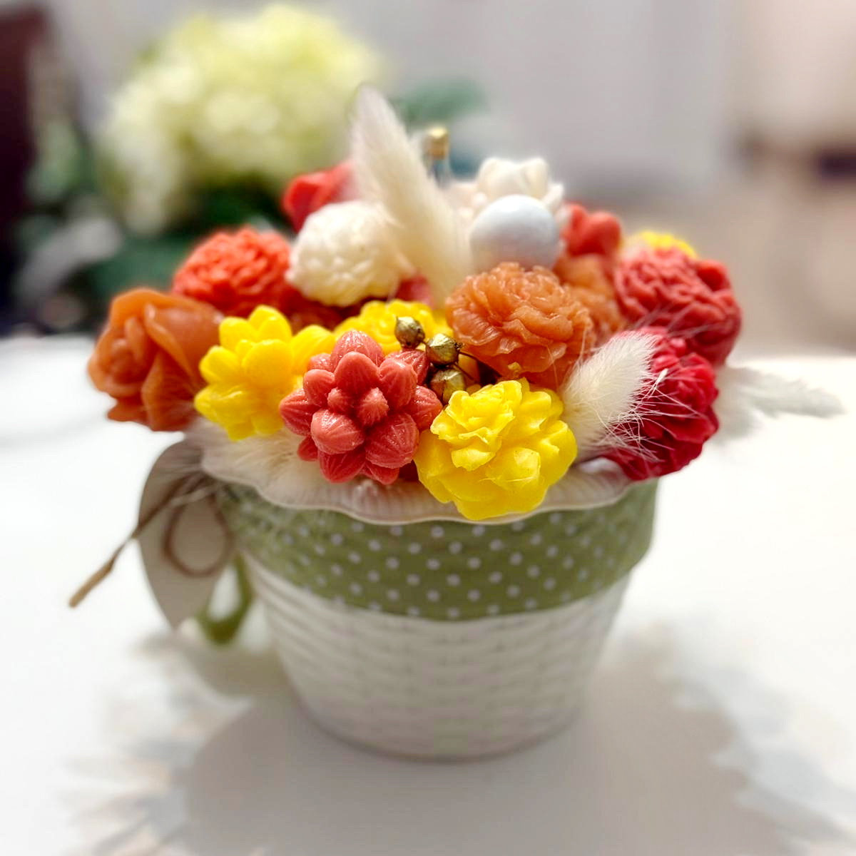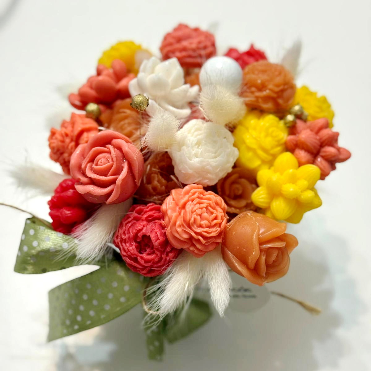 Fiecare aranjament cu flori din săpun este turnat individual. Aranjamentele sunt unicat, culorile florilor fiind diferite.