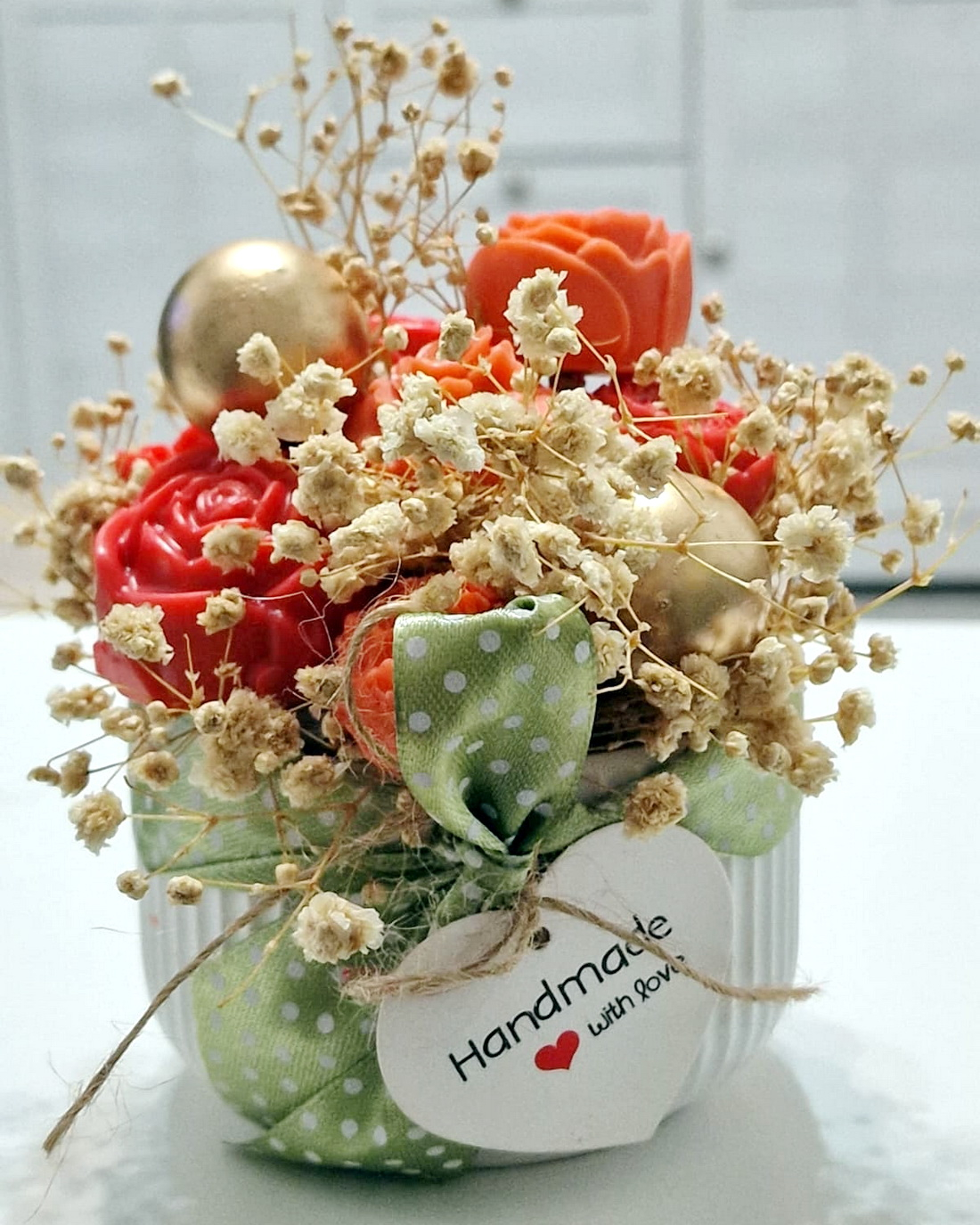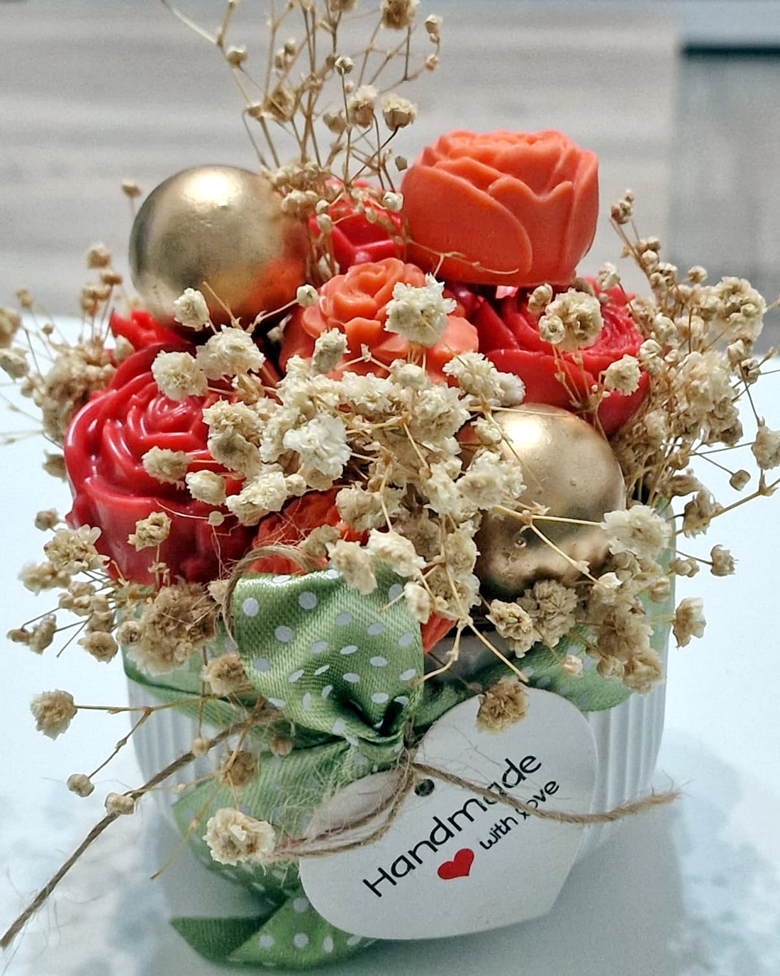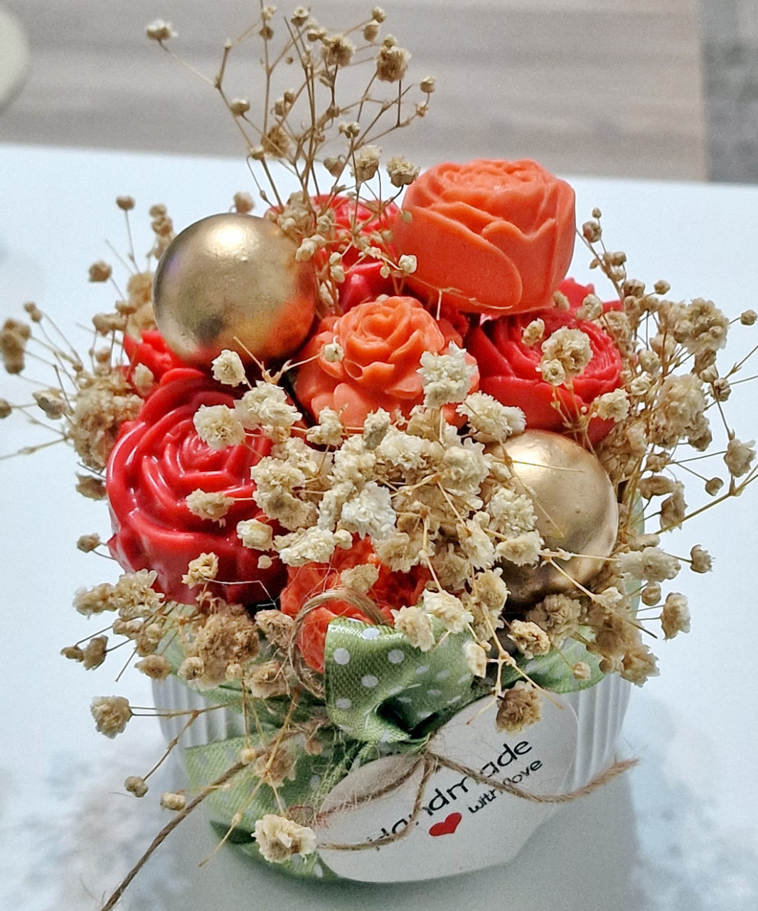 Fiecare aranjament cu flori din săpun este turnat individual. Aranjamentele sunt unicat, culorile florilor fiind diferite.