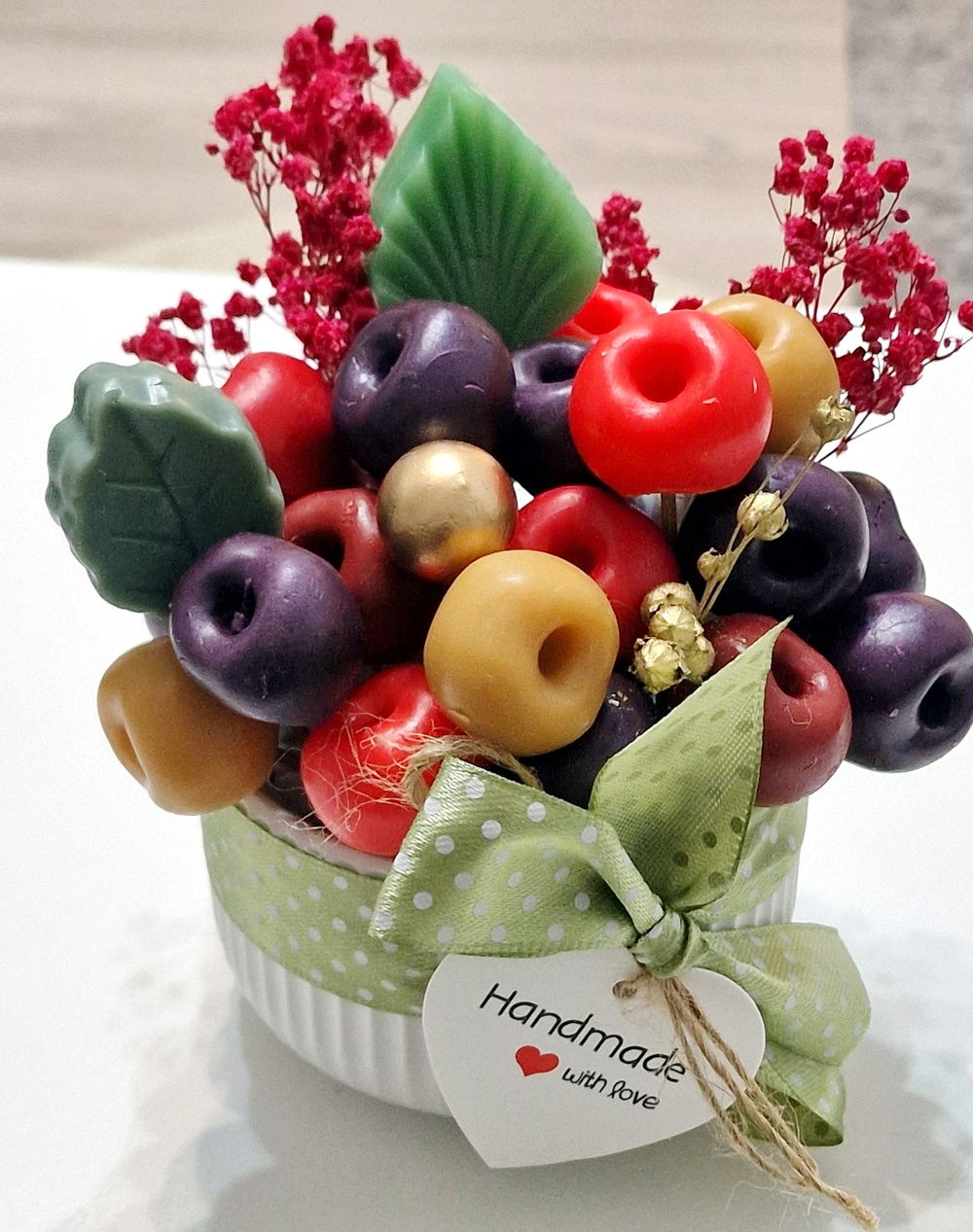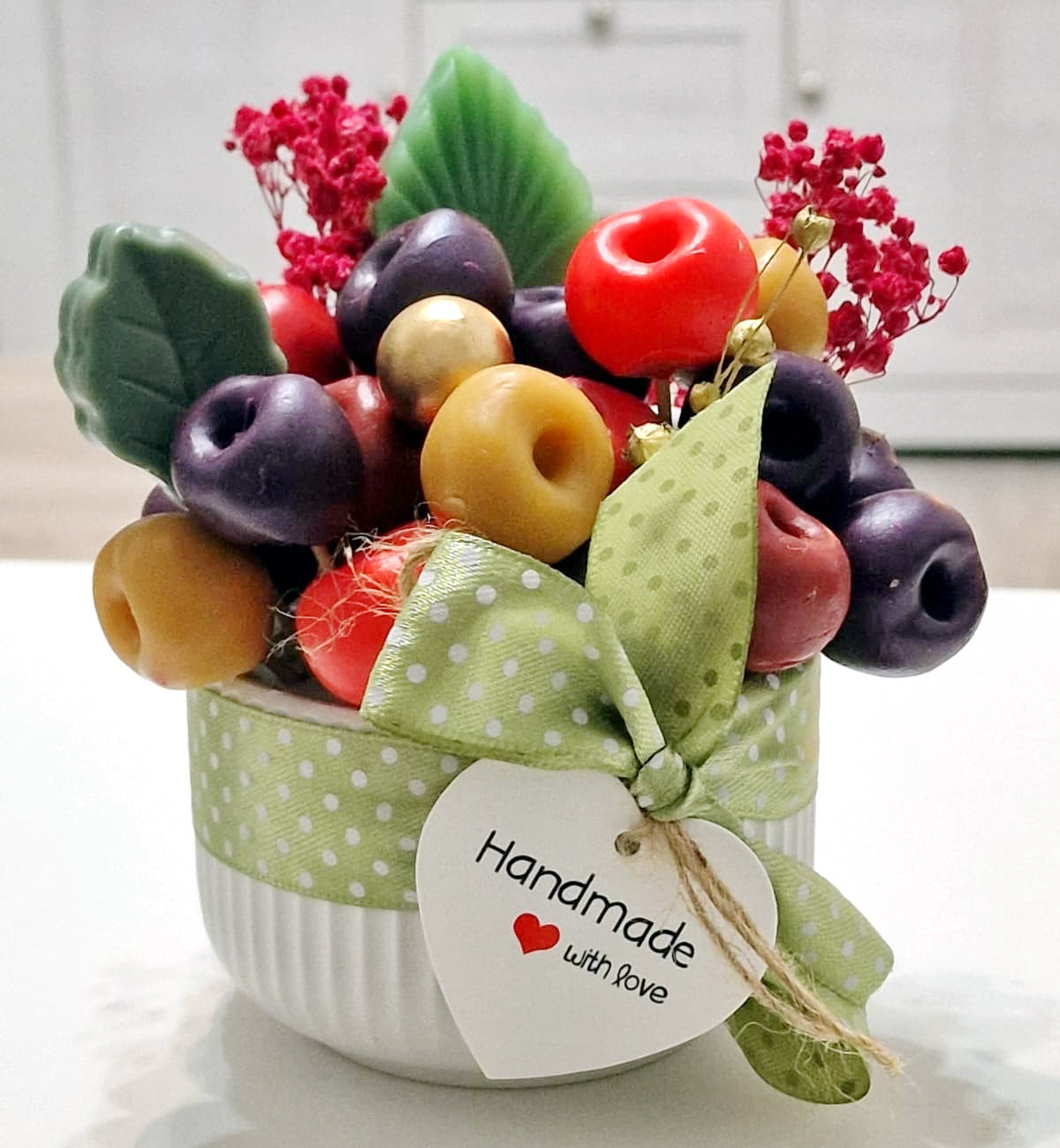 Fiecare aranjament cu fructe din săpun este turnat individual. Aranjamentele sunt unicat, culorile fructelor fiind diferite.