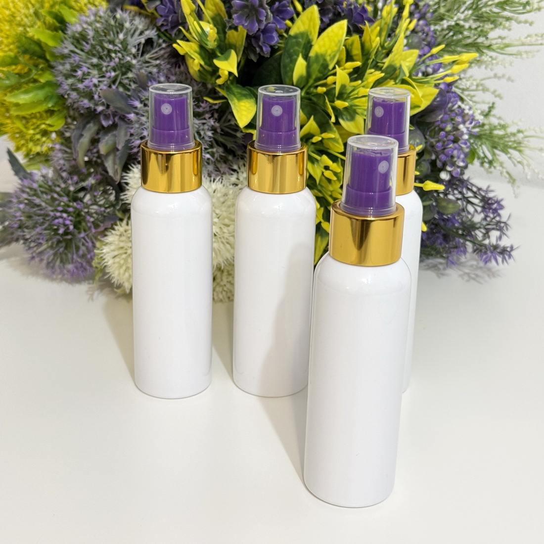 Flacon PET din plastic alb cu pulverizator tip spray (mărime: 24/410) de culoare mov cu inel auriu si capac, capacitate 100 ml.
