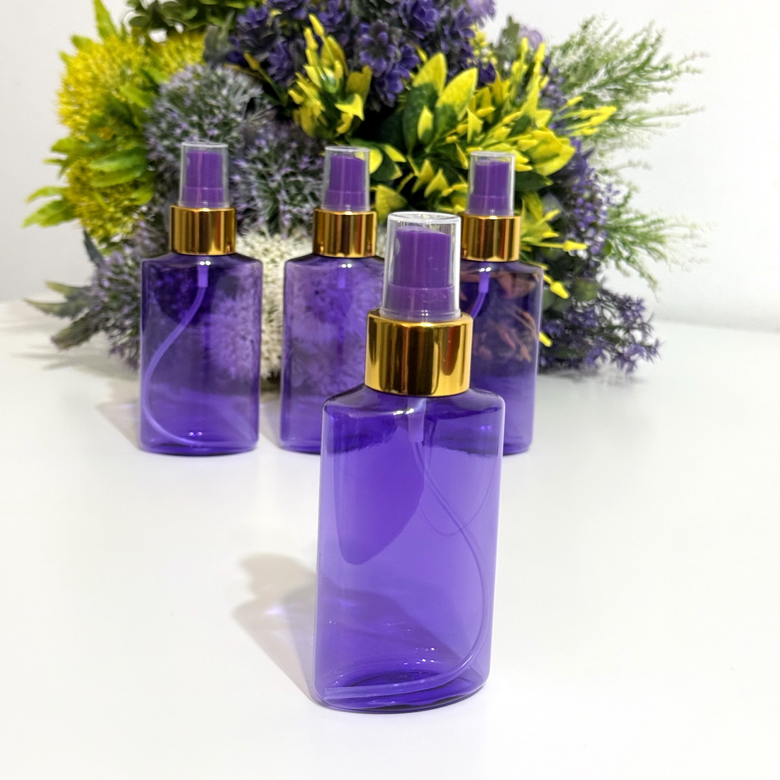 Set 50 flacoane PET din plastic mov transparent plate cu pulverizator tip spray mov (mărime: 24/410) cu inel auriu si capac, capacitate 100 ml.