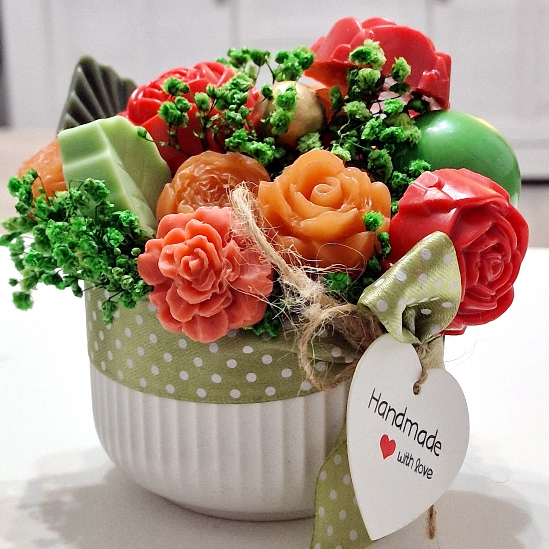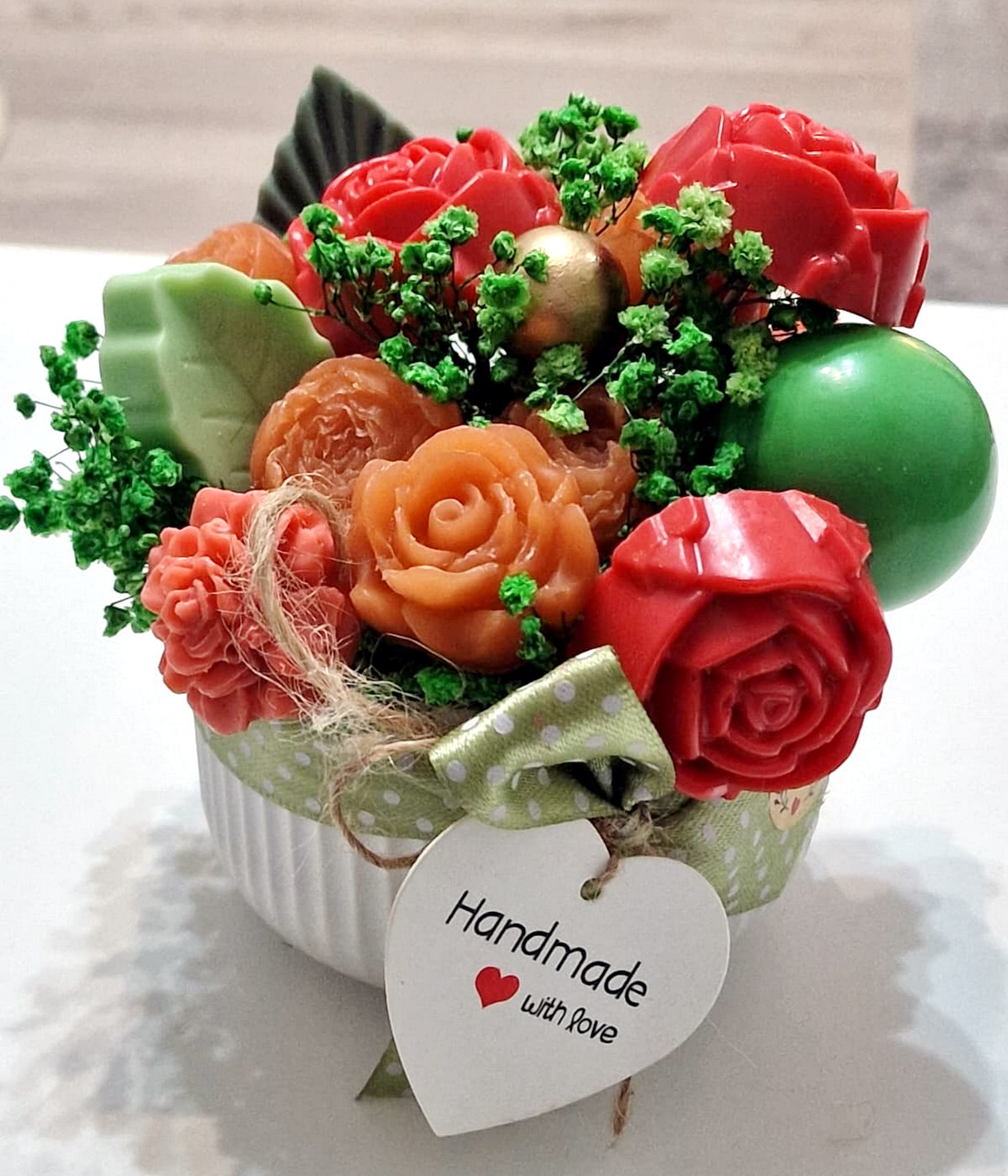 Fiecare aranjament cu flori din săpun este turnat individual. Aranjamentele sunt unicat, culorile florilor fiind diferite.