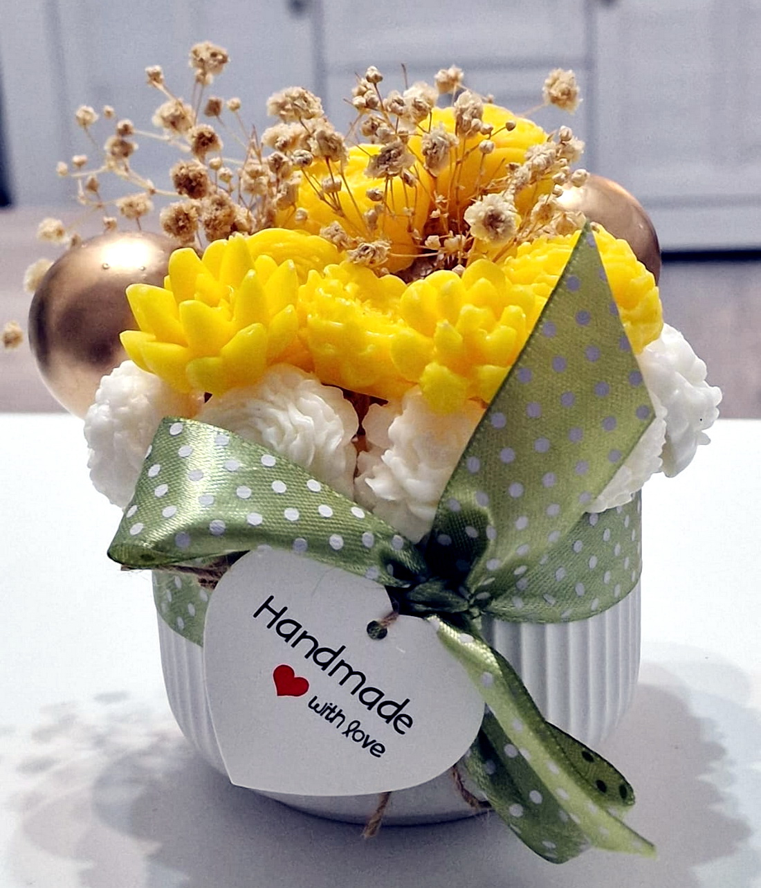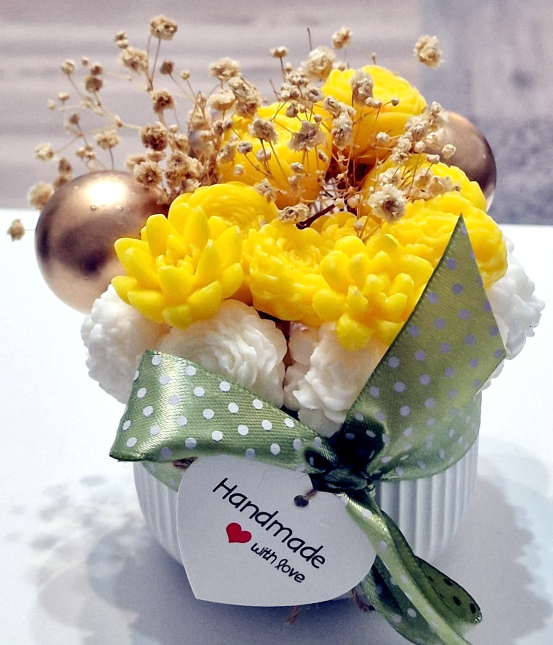 Fiecare aranjament cu flori din săpun este turnat individual. Aranjamentele sunt unicat, culorile florilor fiind diferite.