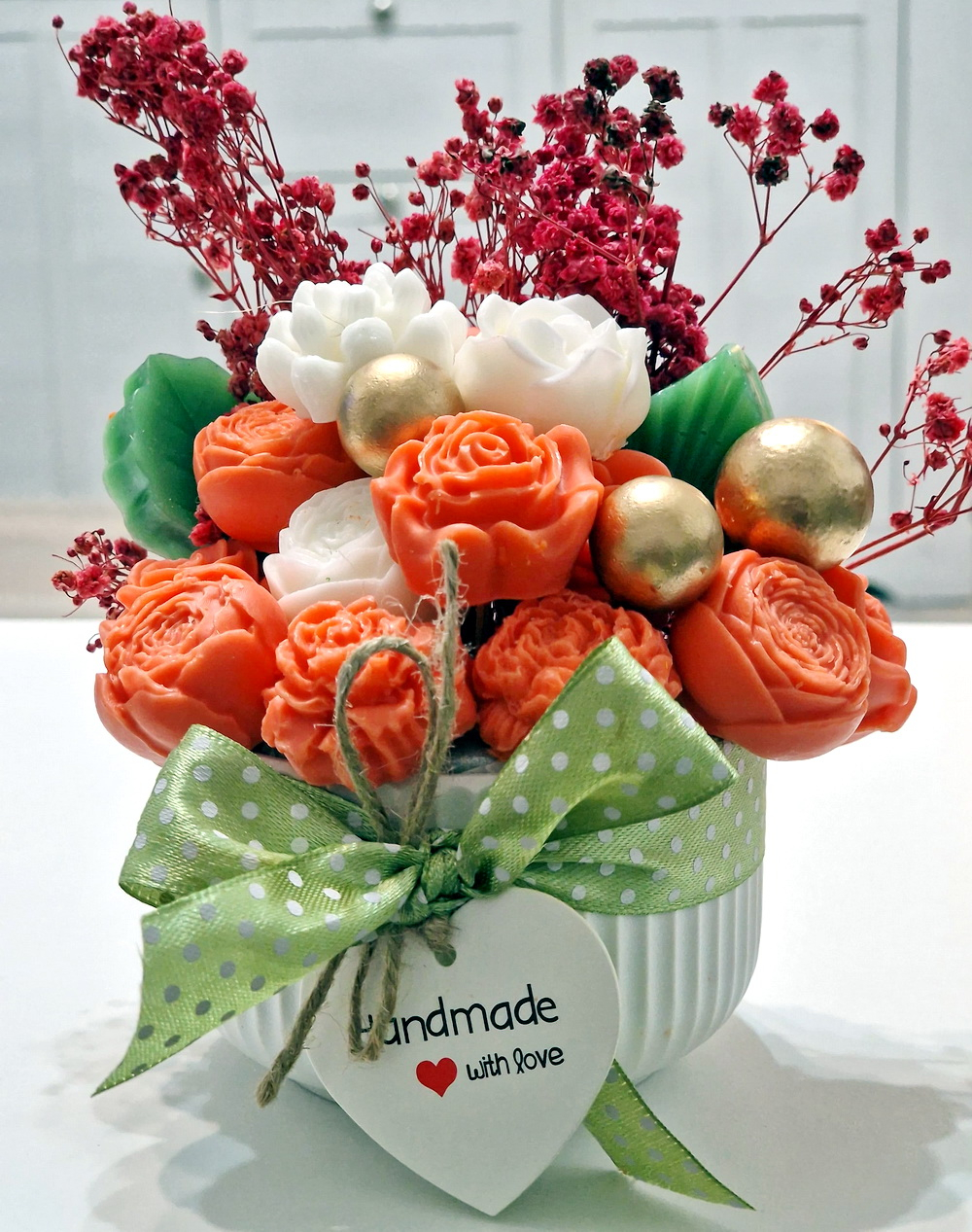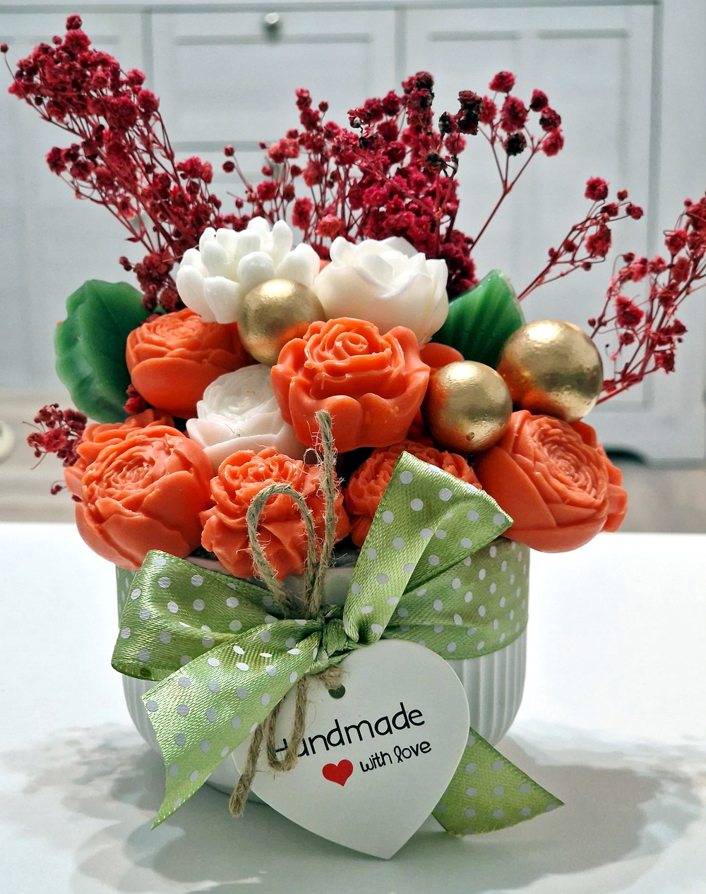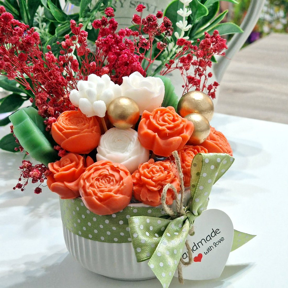 Fiecare aranjament cu flori din săpun este turnat individual. Aranjamentele sunt unicat, culorile florilor fiind diferite.