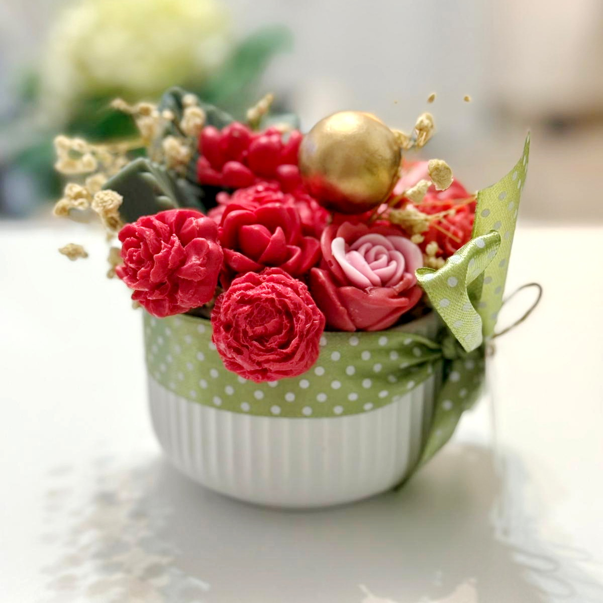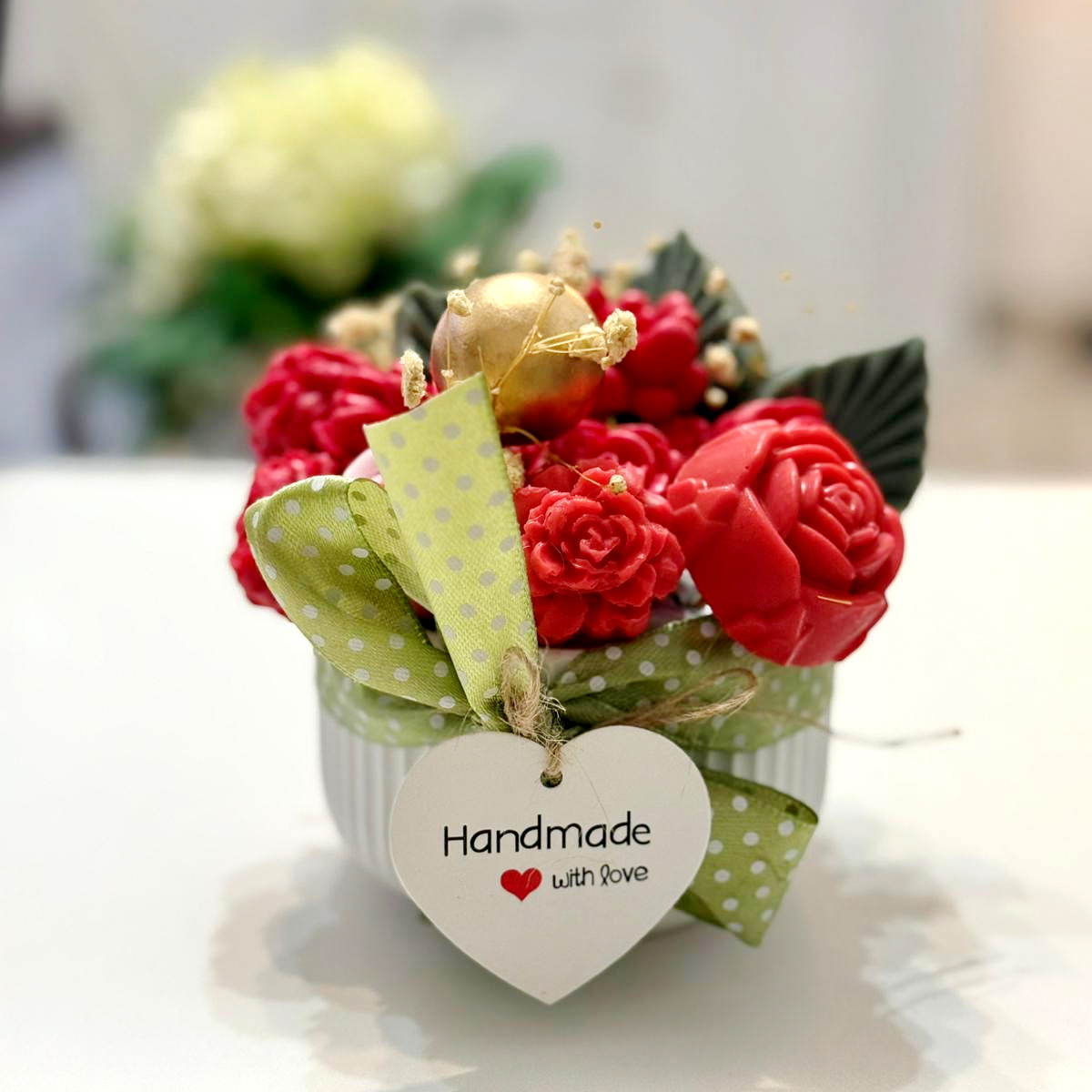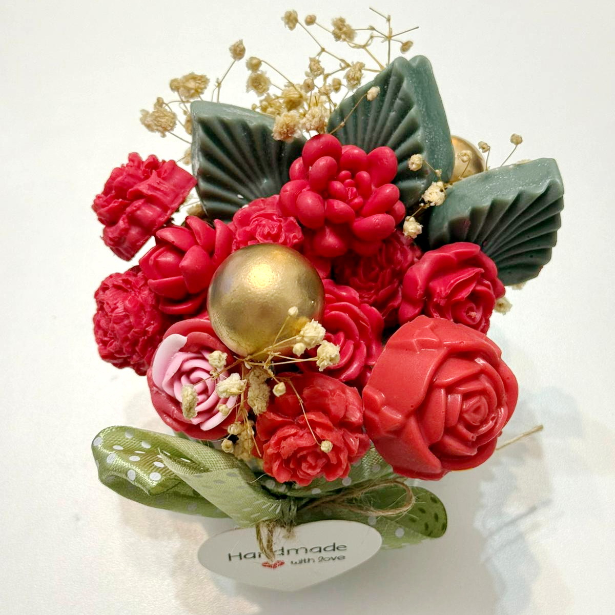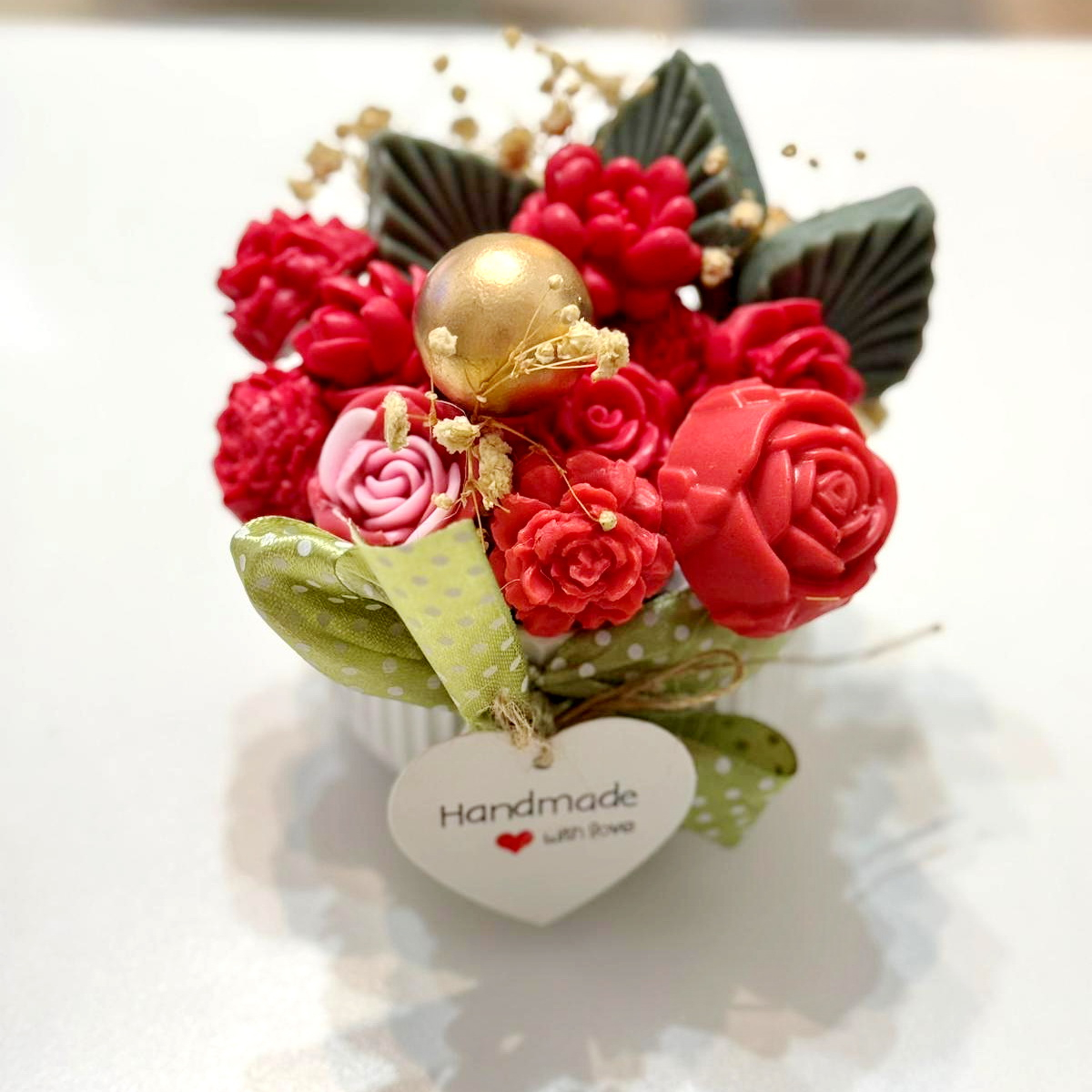 Fiecare aranjament cu flori din săpun este turnat individual. Aranjamentele sunt unicat, culorile florilor fiind diferite.