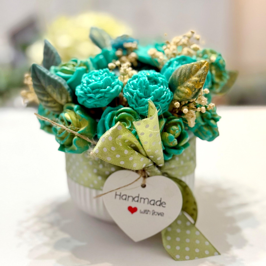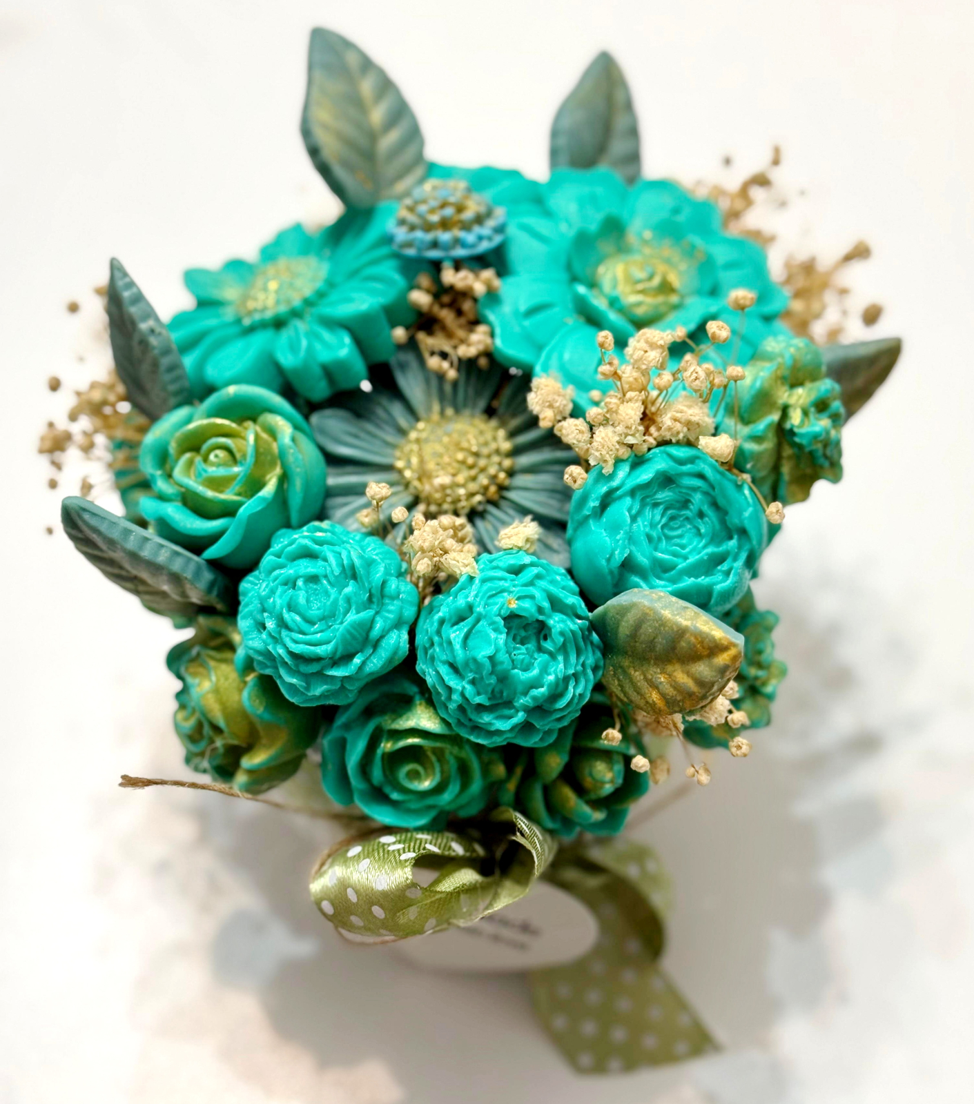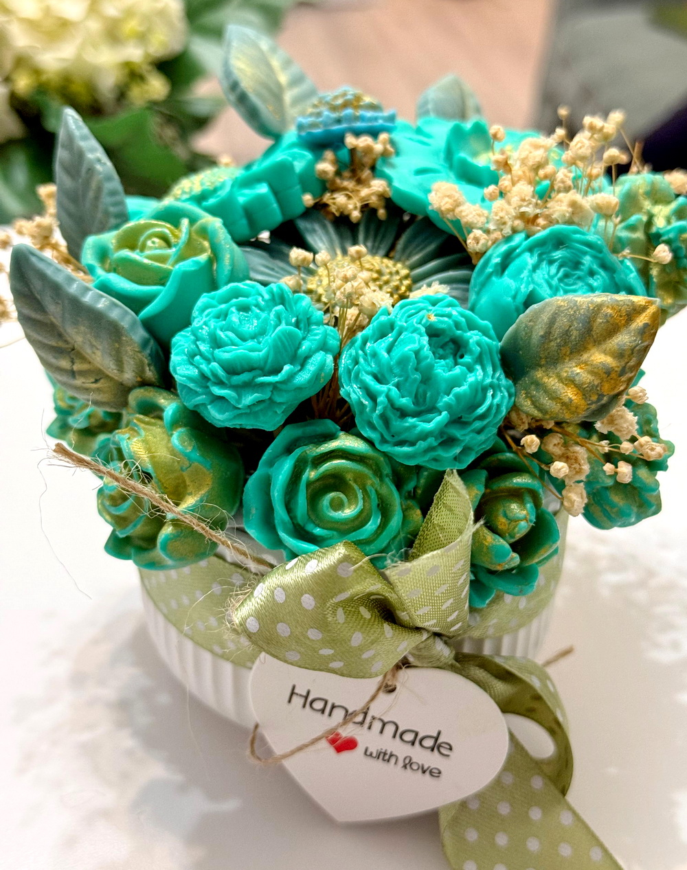 Fiecare aranjament cu flori din săpun este turnat individual. Aranjamentele sunt unicat, culorile florilor fiind diferite.
