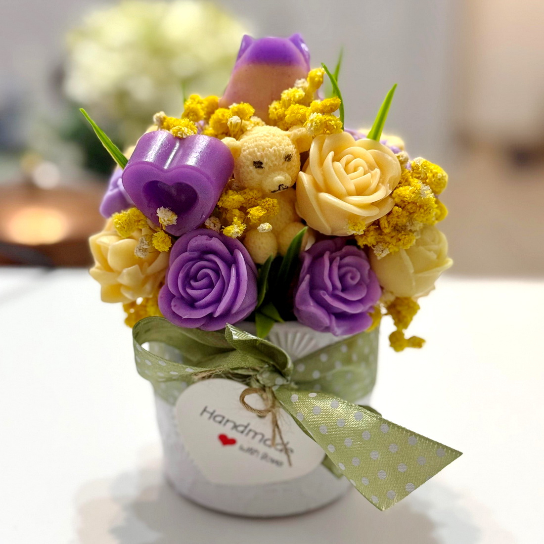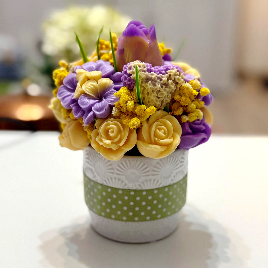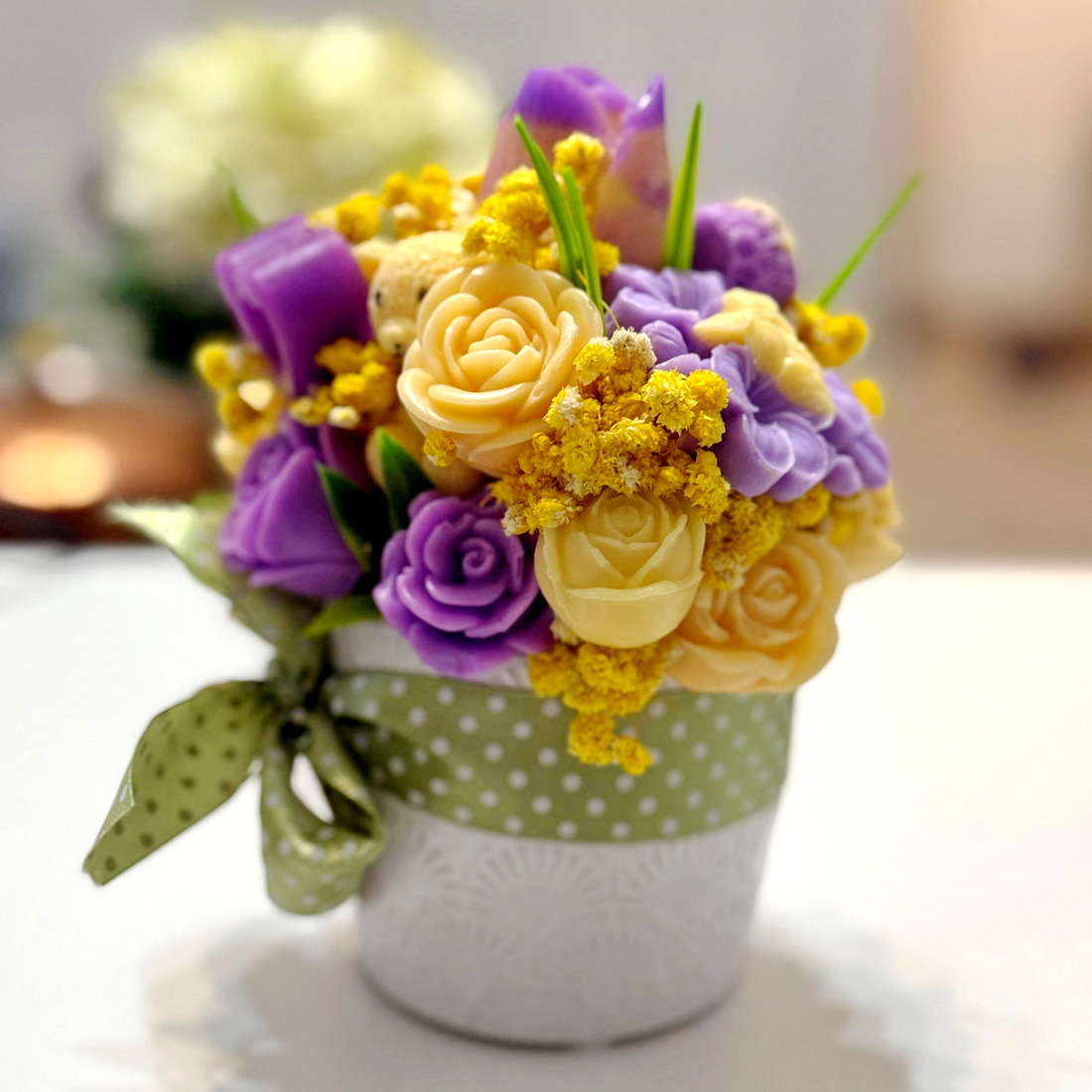Fiecare aranjament cu flori din săpun este turnat individual. Aranjamentele sunt unicat, culorile florilor fiind diferite.