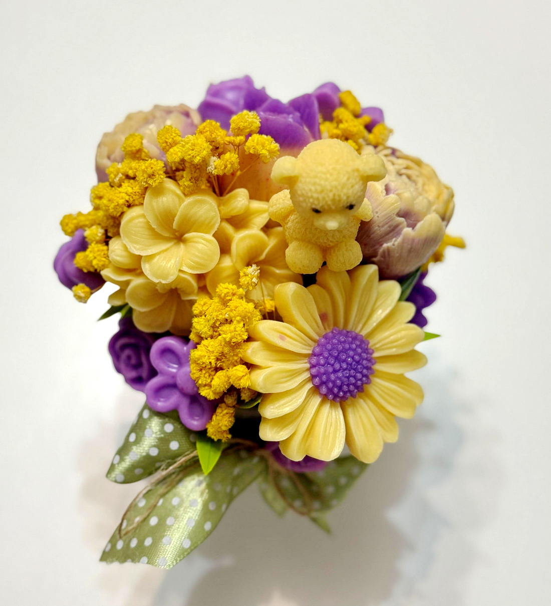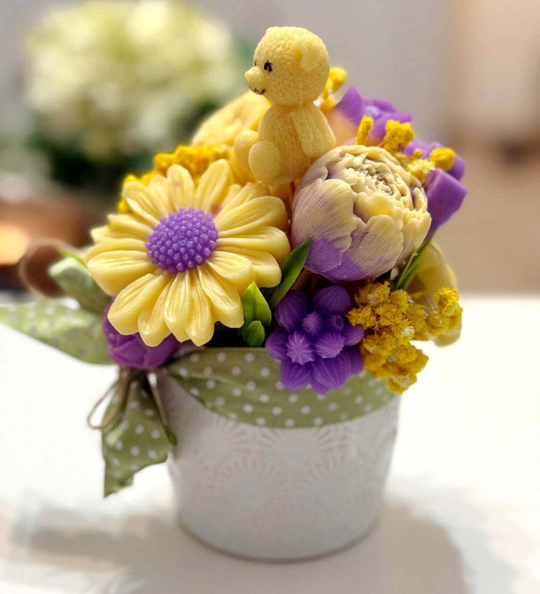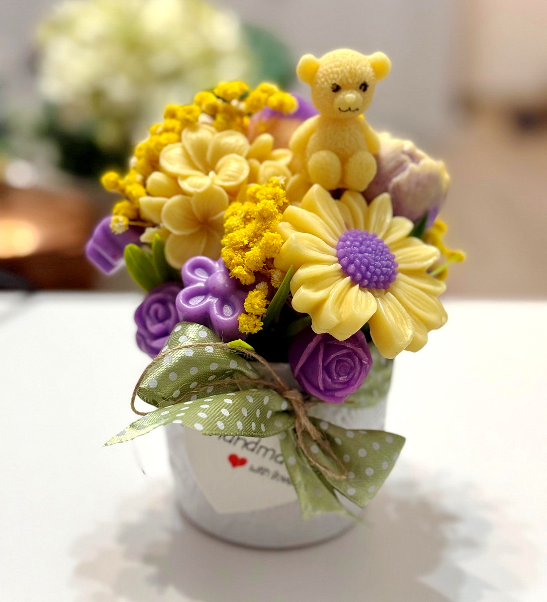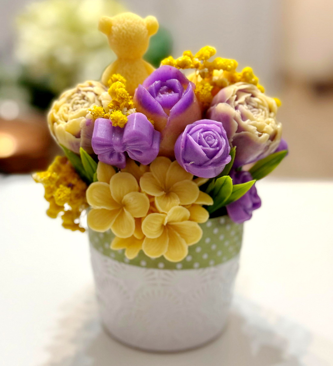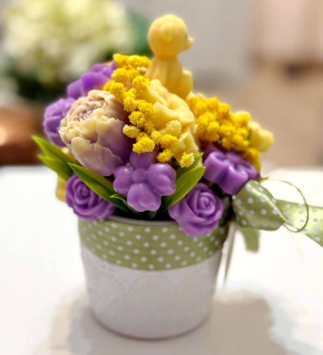 Fiecare aranjament cu flori din săpun este turnat individual. Aranjamentele sunt unicat, culorile florilor fiind diferite.