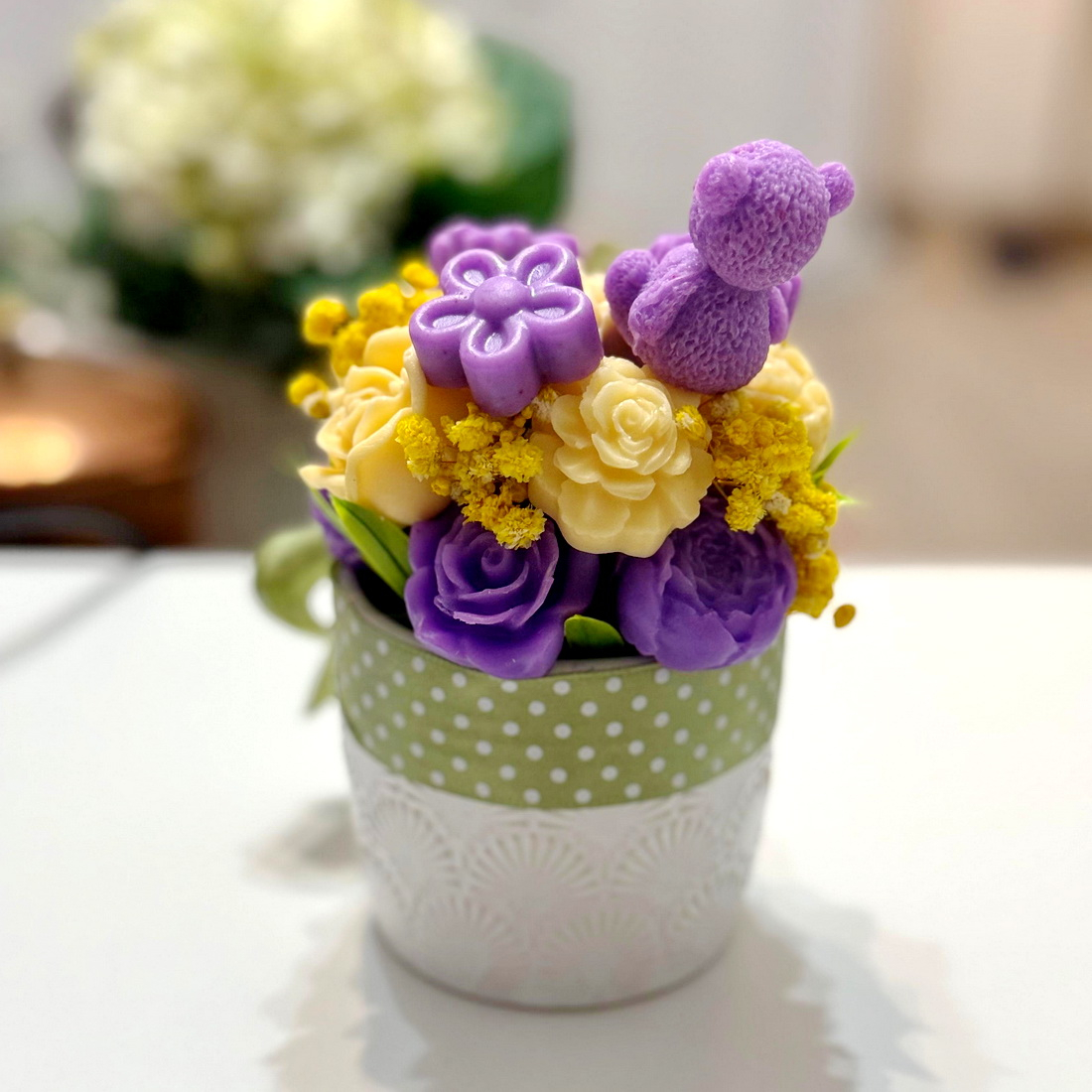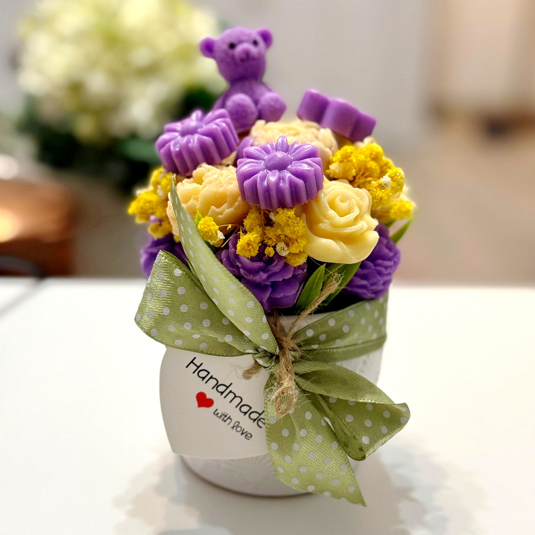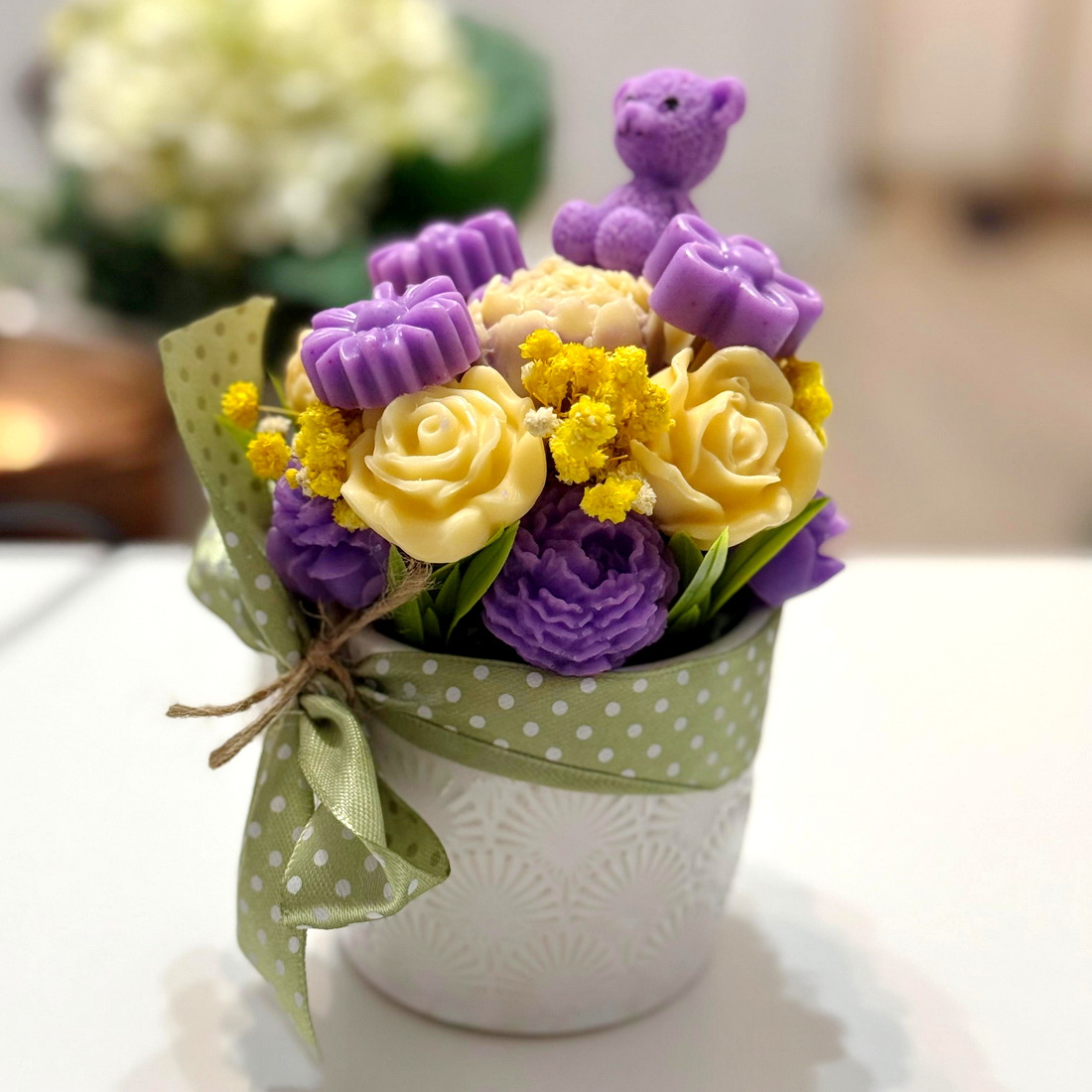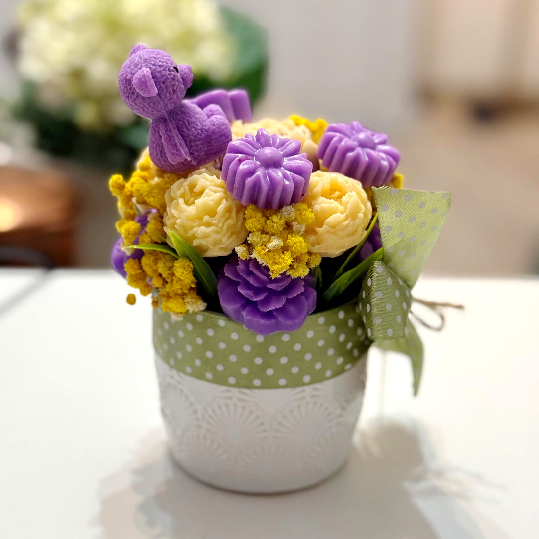 Fiecare aranjament cu flori din săpun este turnat individual. Aranjamentele sunt unicat, culorile florilor fiind diferite.