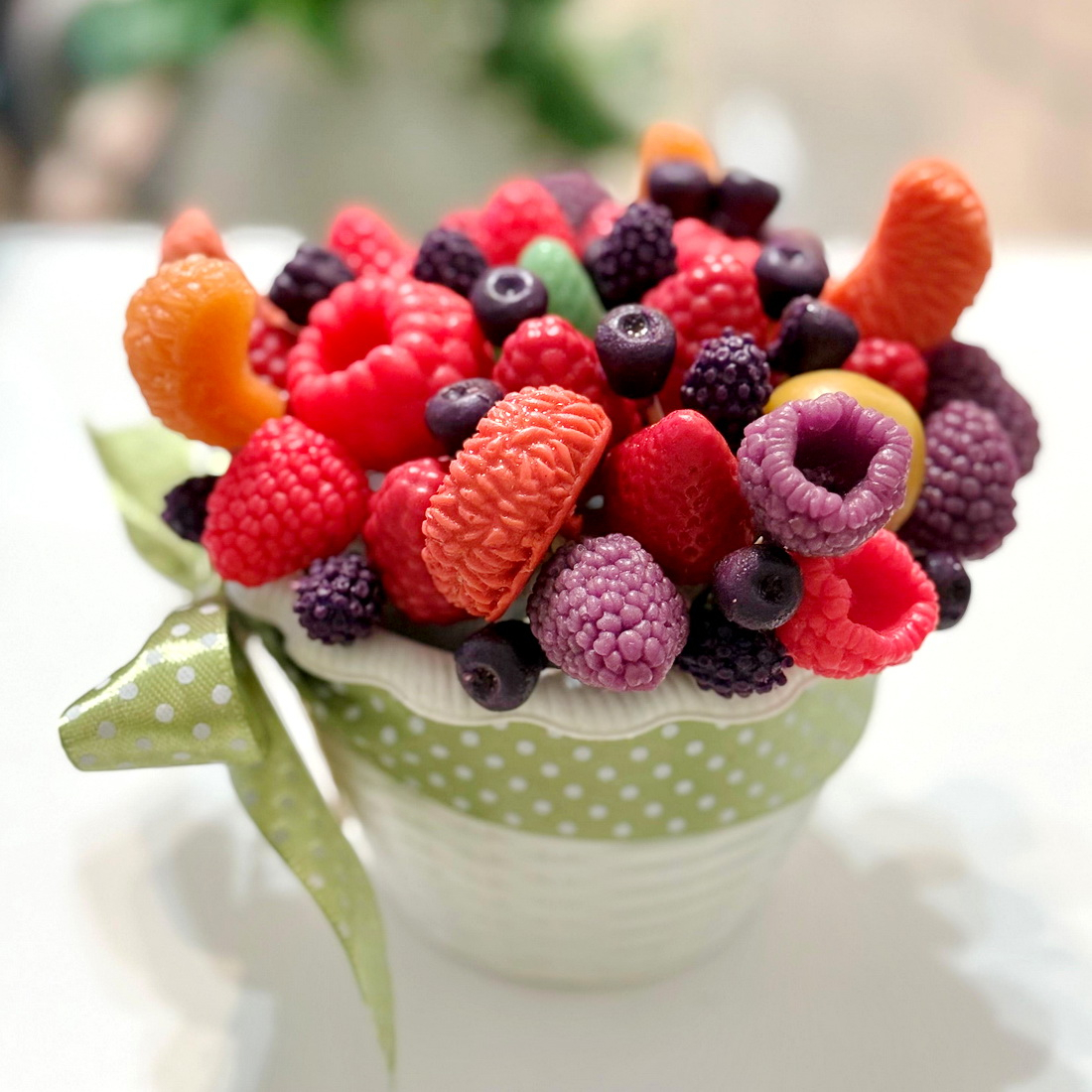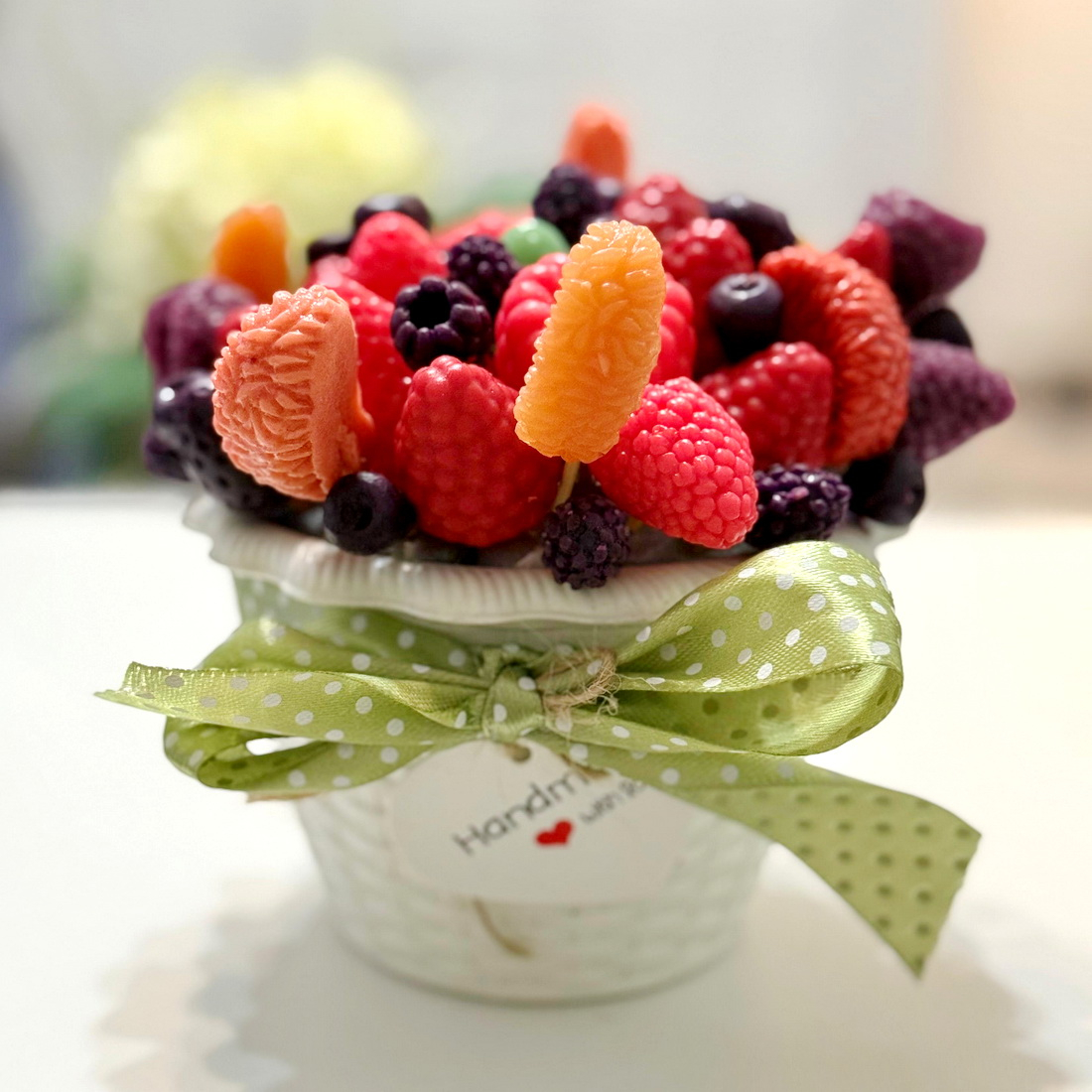 Fiecare aranjament cu fructe din săpun este turnat individual. Aranjamentele sunt unicat, culorile fructelor fiind diferite.