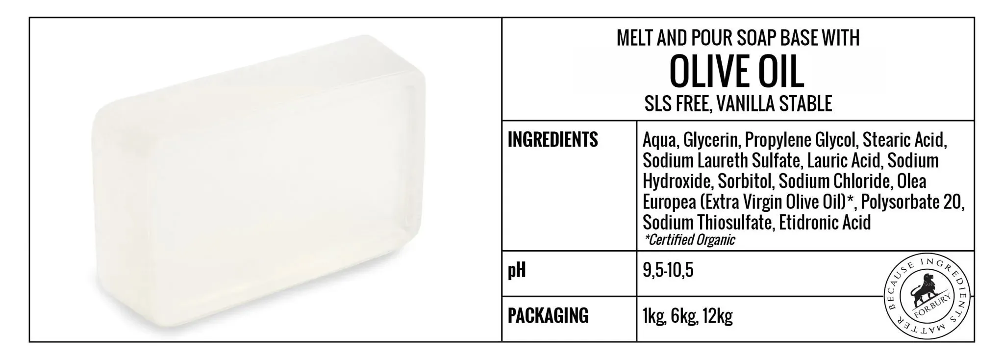 Bază melt & pour transparentă, creată cu ulei de măsline organic, ideală pentru obținerea unui săpun artizanal de calitate superioară. Este foarte moale, hidratantă și oferă o spumă bogată și cremoasă. Datorită unei tehnici speciale de încorporare a uleiului de măsline după saponificare, toate beneficiile acestuia sunt păstrate în săpun, oferind pielii hidratare și catifelare, fără a compromite claritatea bazei.
