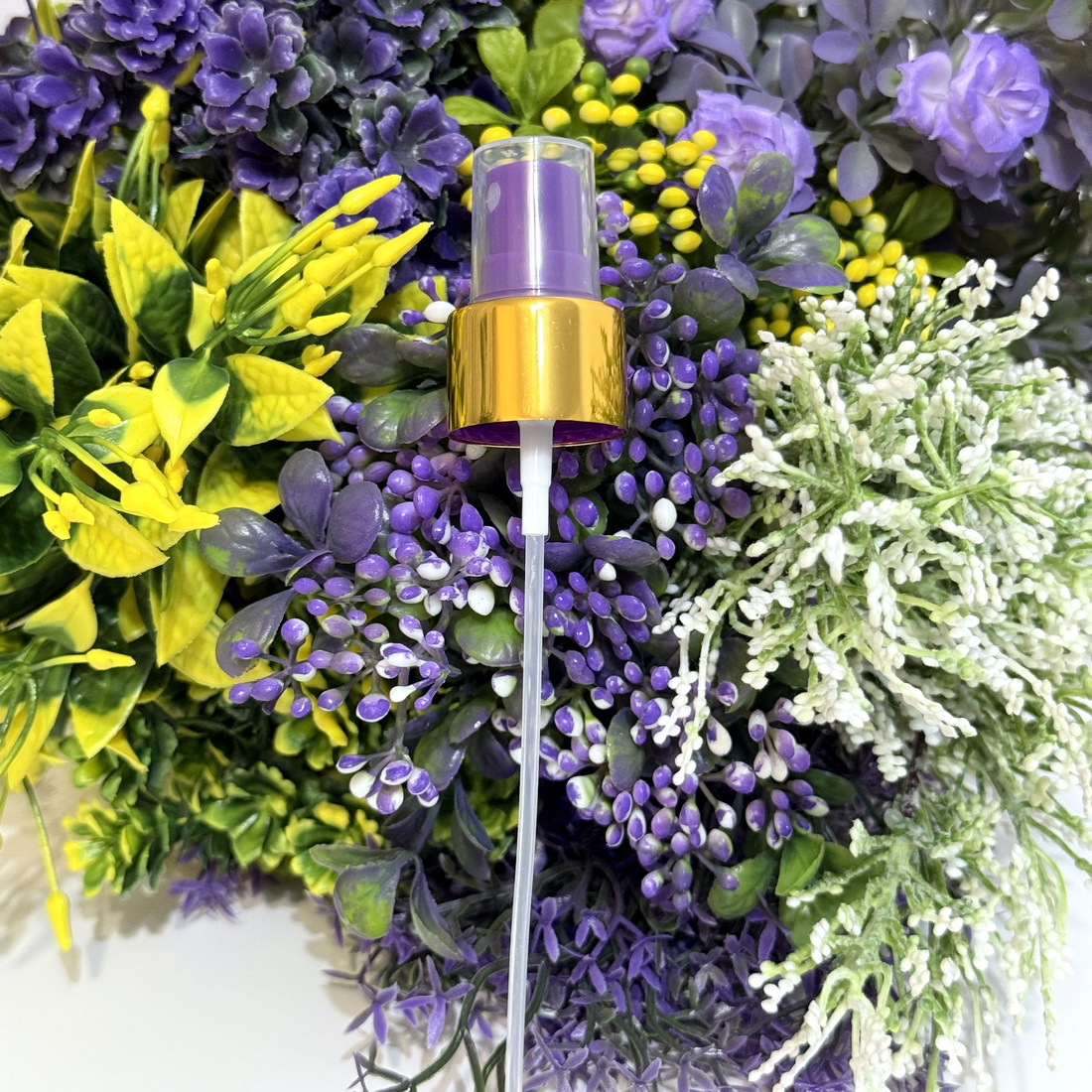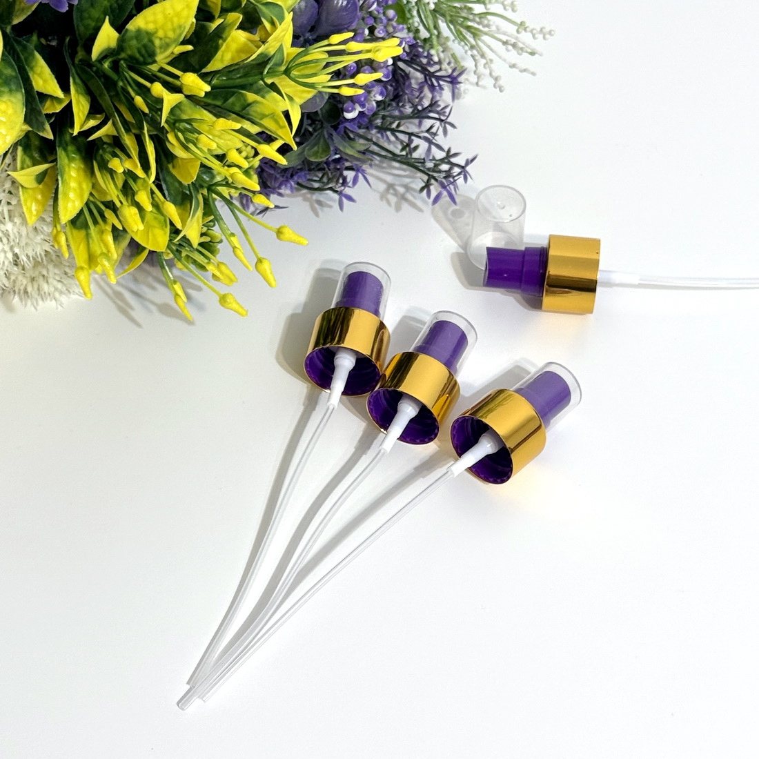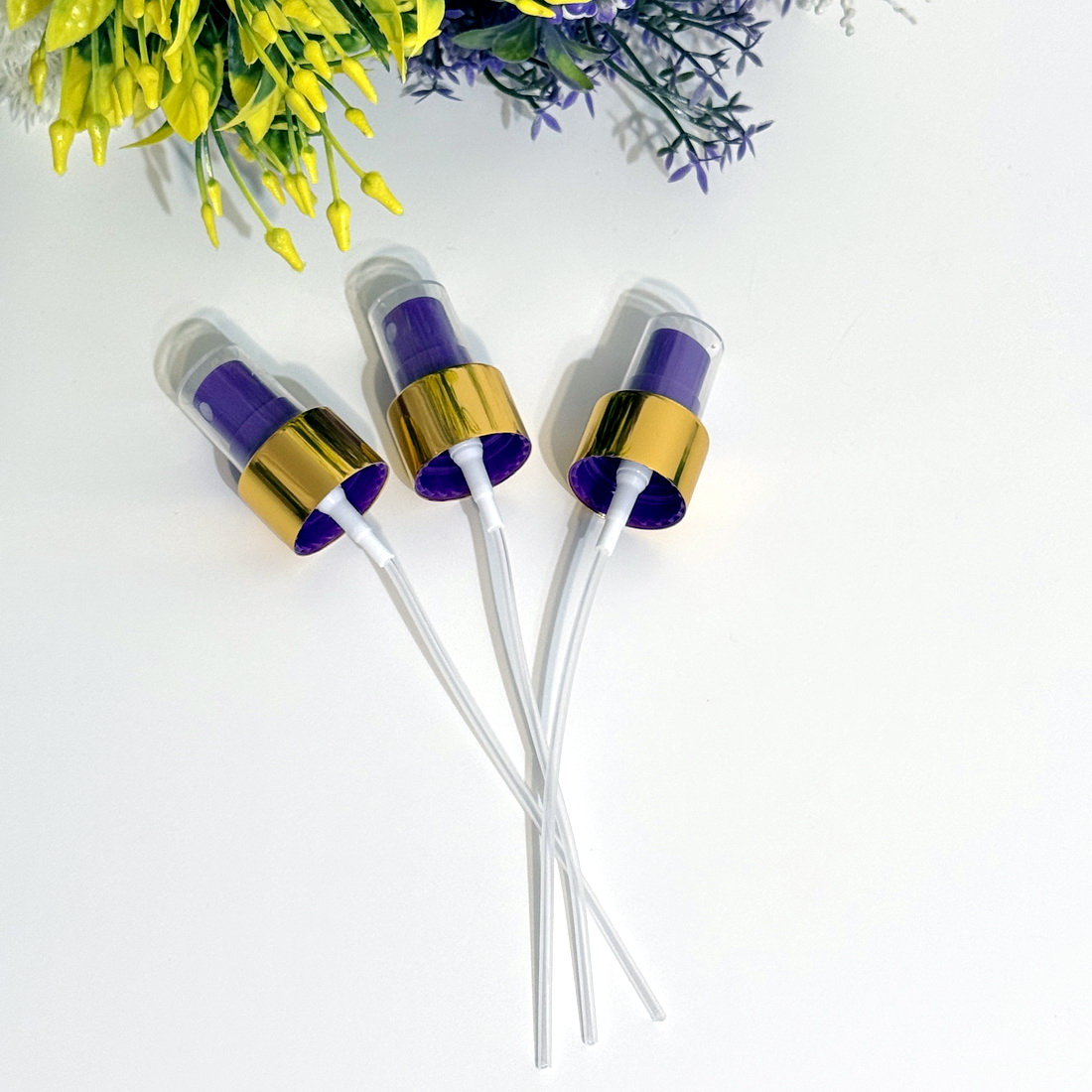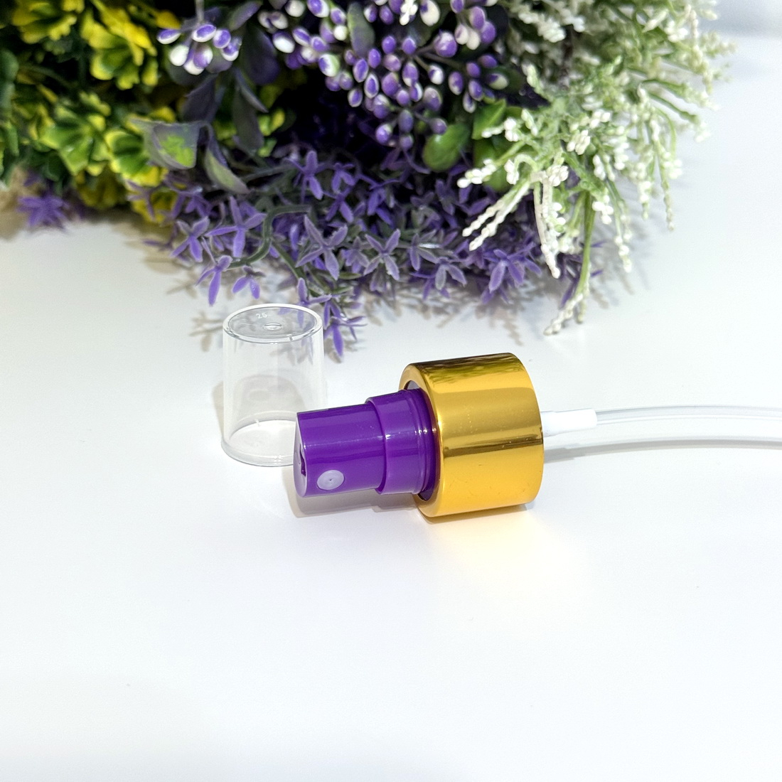 Pulverizator din plastic mov cu inel auriu și capac transparent (mărime: 24/410) lungime tub 120 mm.