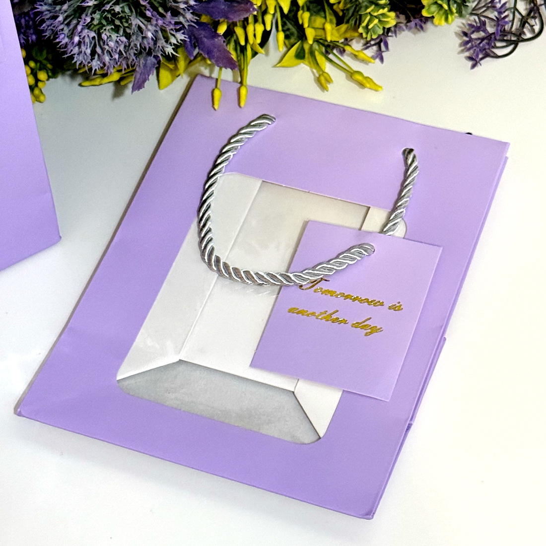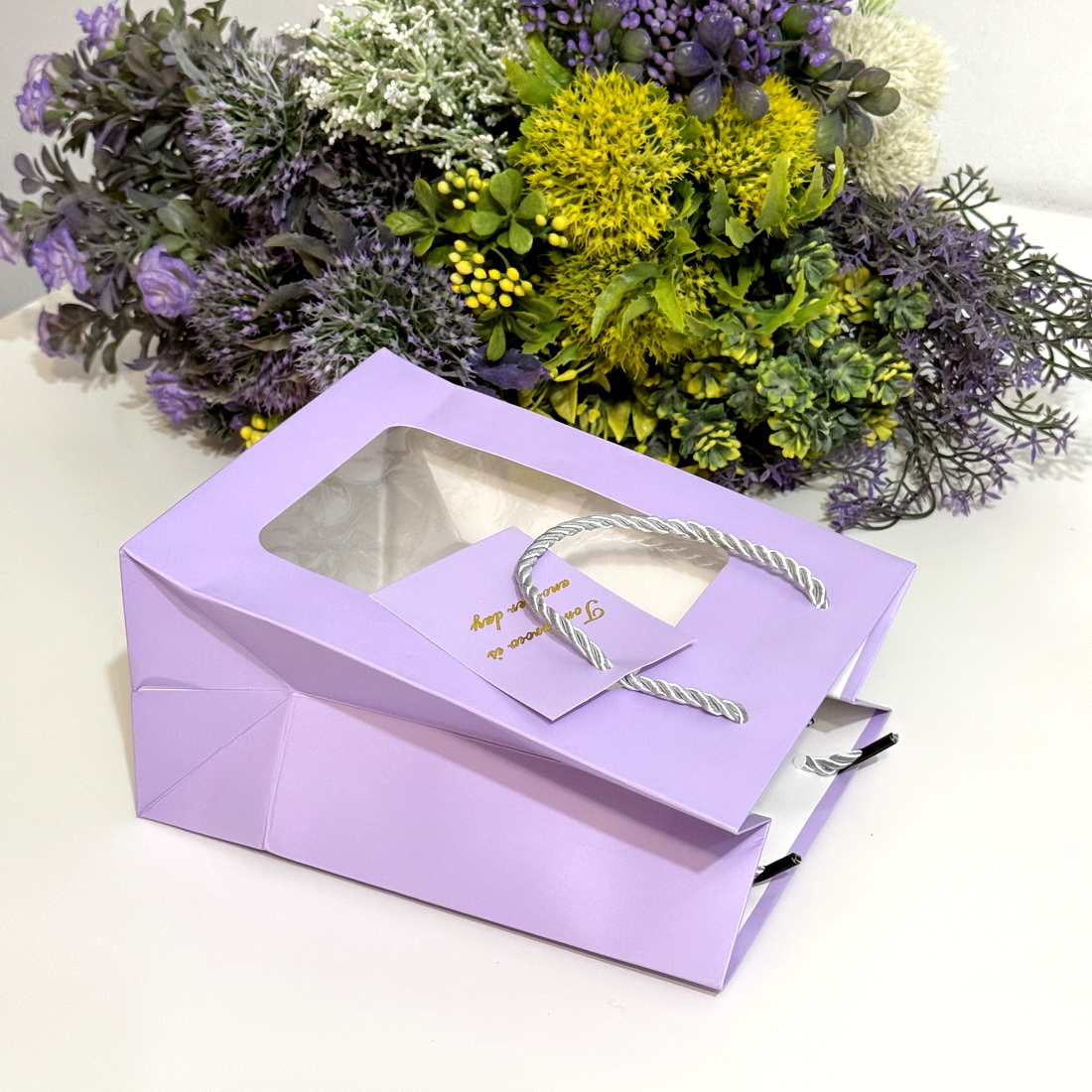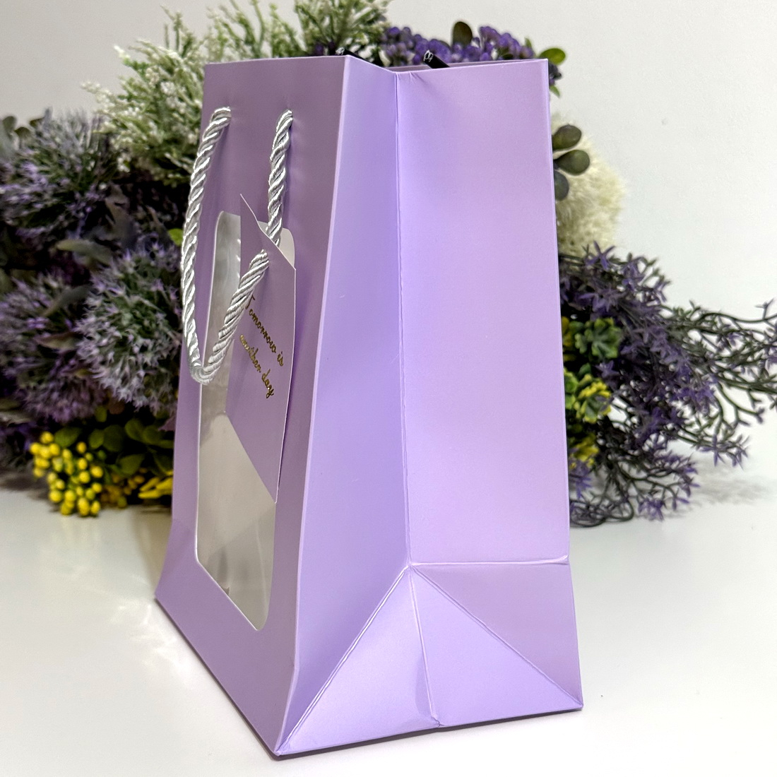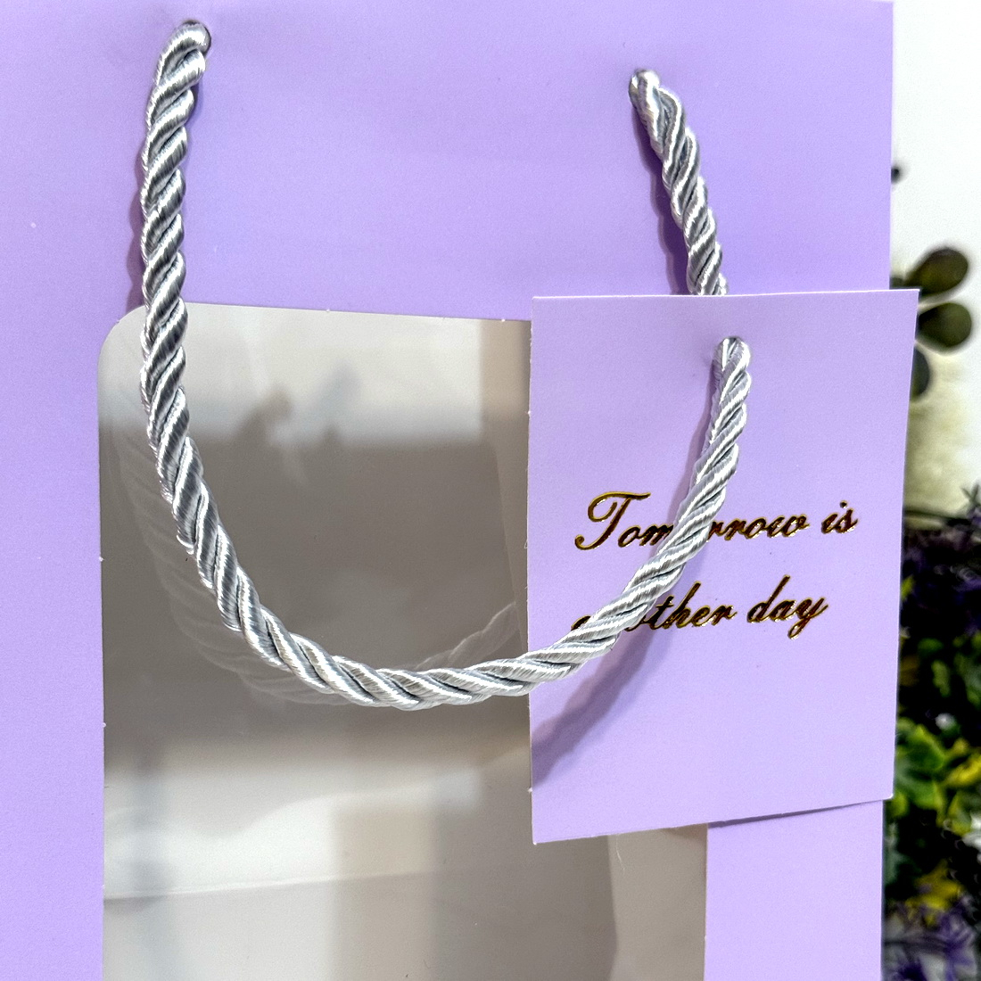 Pungă pentru cadouri din hârtie cartonată lucioasă mov cu mâner din șnur argintiu impletit. Pungile au mânere deosebite din șnur gros de culoare argintie și sunt prevăzute cu întăritură metalică la capete. Pungile au o deschidere de 10 cm și sunt prevăzute cu fereastră transparentă. Sunt foarte potrivite pentru cadouri, catering, activități promoționale, flori de dimensiuni mici, ș.a.