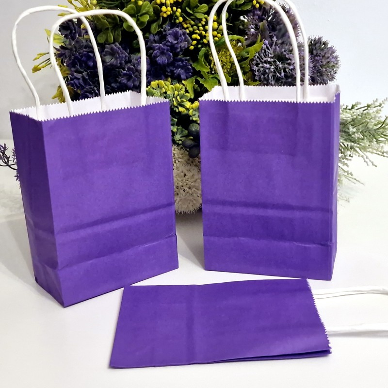 Pungi din hârtie de culoare mov închis pentru cadouri, cu mâner rezistent din hârtie întărită. Pungile au mâner din hârtie răsucită și dispun de o întăritură lipită pe interior pentru o rezistență crescută. Sunt foarte potrivite pentru cadouri de mici dimensiuni, catering, activități promoționale, ș.a.