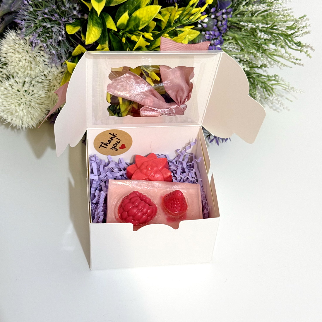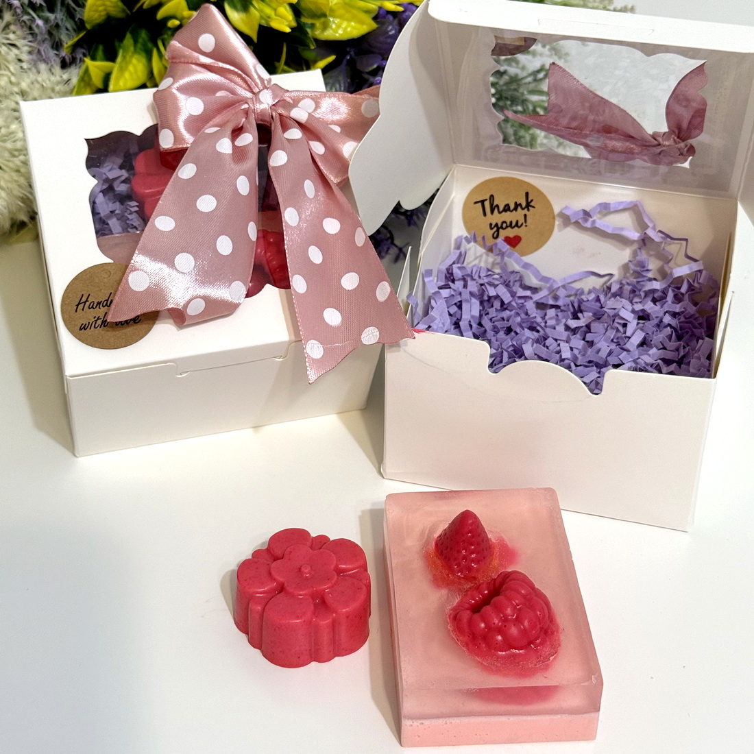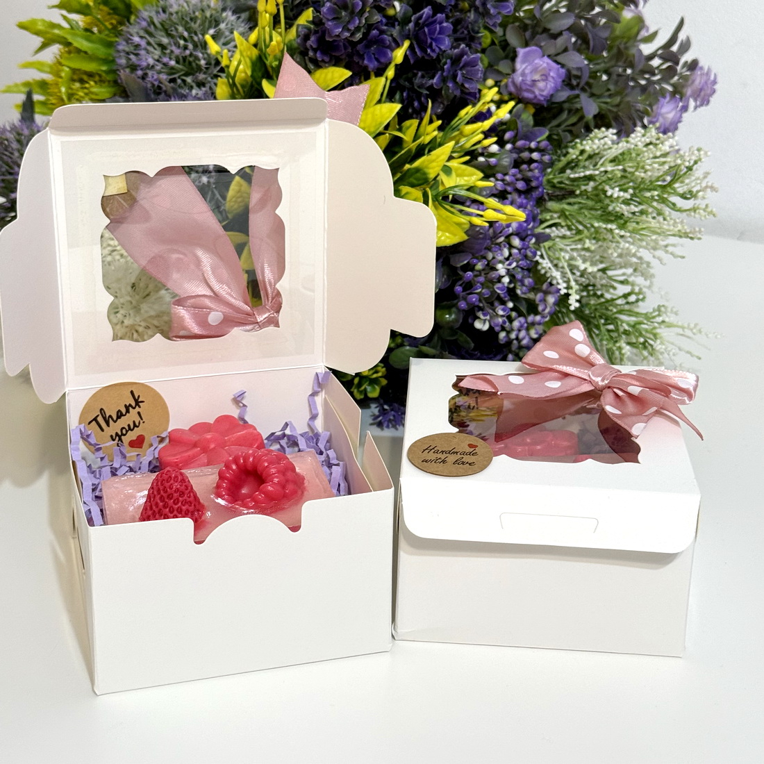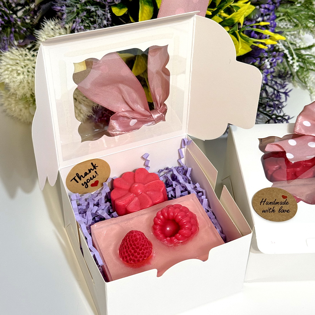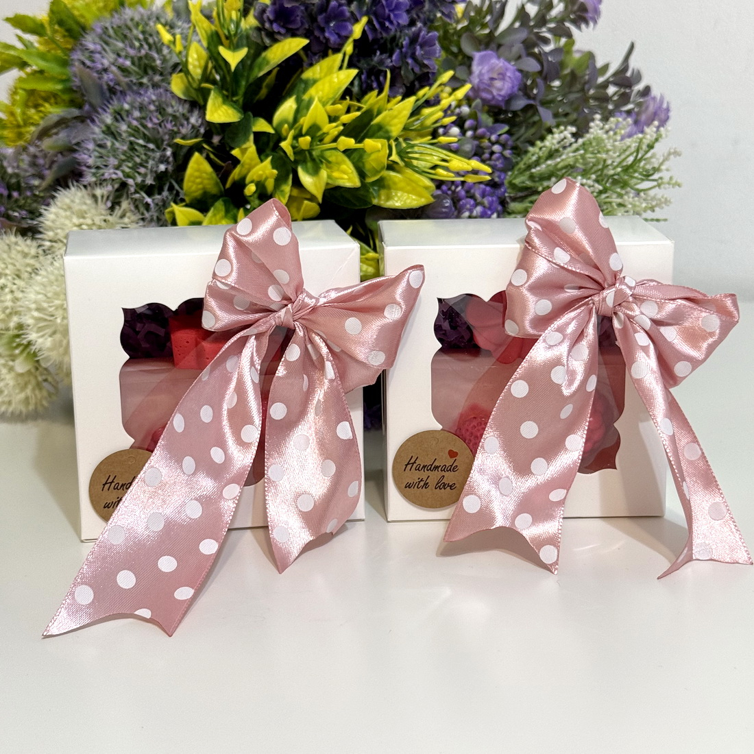Săpunurile sunt unt ambalate în cutii individuale cu prezentare premium, în cutie albă cu fundă roz din panglică aplicată, gata pentru a fi oferite cadou !